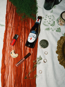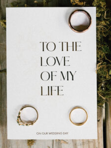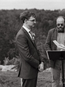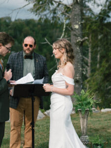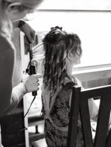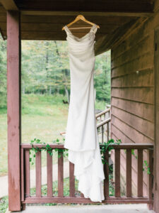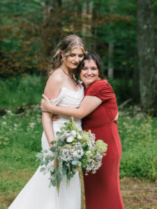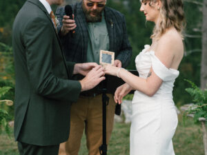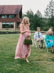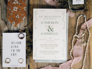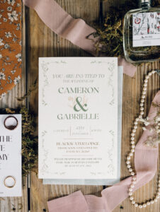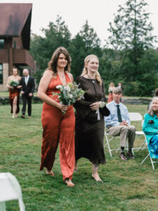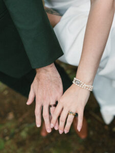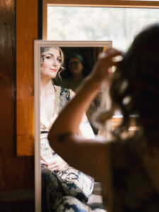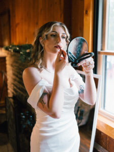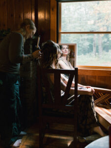 Logan and I finally arrived at Gabs’ cabin, where she and her party were getting ready together. Even though the rain wasn’t ideal, it made for a cozy + calm atmosphere. I took some detail flat lay shots on the porch with their invitations, rings, and lots of moss and baby’s breath. If you’re not sure what to include in detail photos to give your photographer, always save or ask for some clippings from your florist!