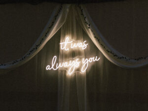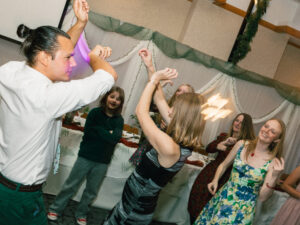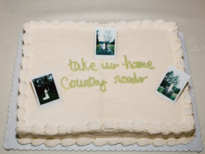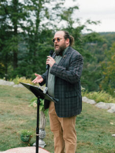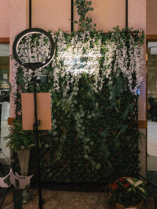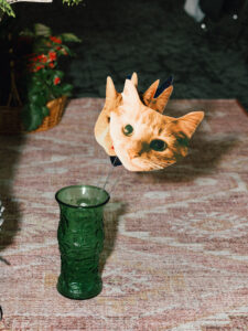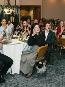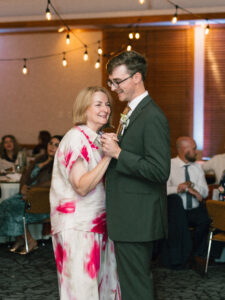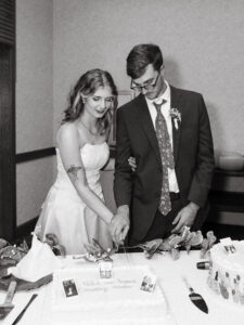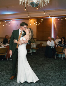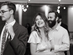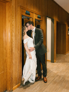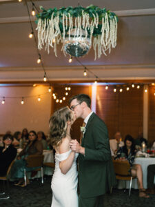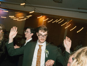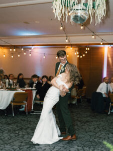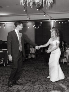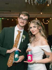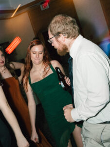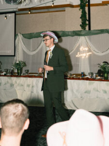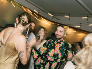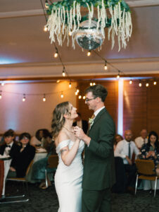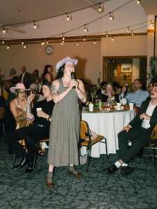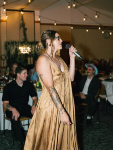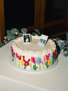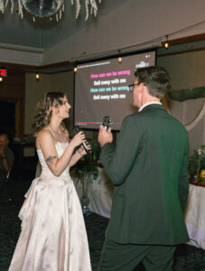 The wedding party made their grand entrance, followed by a thank you speech from the couple and special recognition for Gabs’ mom. After dinner and a few toasts, G + C had their first dance to “Blue Skies Again” and parent dances under the flowered disco ball. Then, the dance floor was officially open! G + C took a break for a few photos in the hallway phone booth (which is SO COOL) and Gabs changed into her reception dress – a lucky vintage Gunne Sax find! They cut the cake, which was decorated with Polaroids taken throughout the day (shoutout to Logan for being in charge of those!). After busting some moves, it was finally time for the moment everyone was waiting for – KARAOKE. G + C opened the night with a duet of “Islands in the Stream”, and guests took their turns serenading the couple with their performances. I was contractually obligated to take part, so I busted out my award-winning performance of “Intergalactic” by the Beastie Boys.