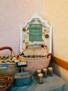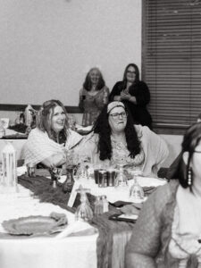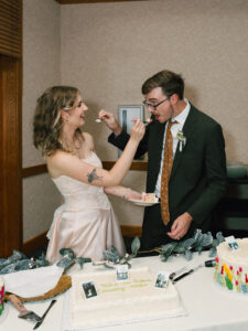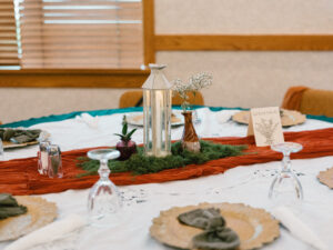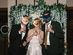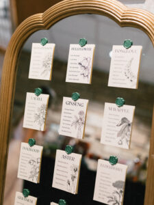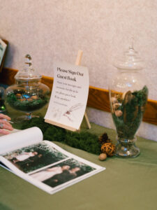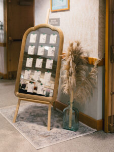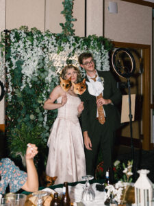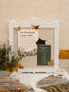 Soon enough, it was time to party inside the Lodge! G + C did an incredible job creating a vintage, eclectic, West Virginian vibe with their decor. The seating chart was a gorgeous gold-framed mirror with wax-sealed cards. Each table was named after a native WV flower! The tables themselves were decked out with lanterns, thrifted bud vases, moss, and eyelet tablecloths. There were also plenty of activities – a photo wall with props featuring their cats, a build-your-own simmer pot station as their favors, and of course, a Pittsburgh cookie table!