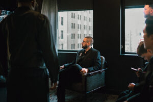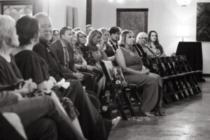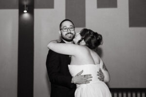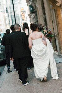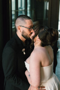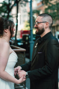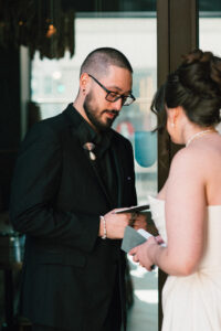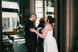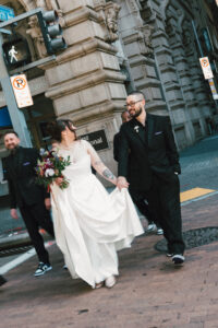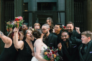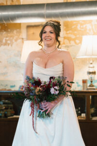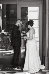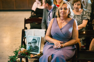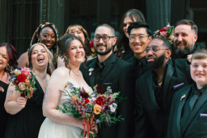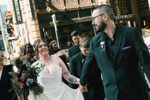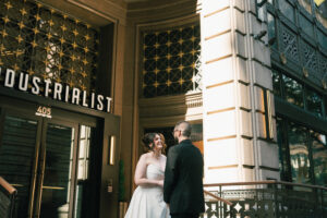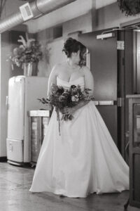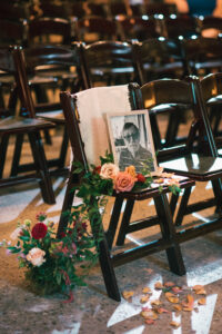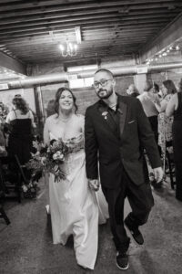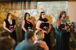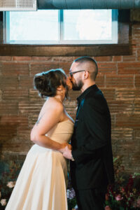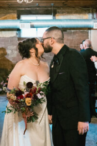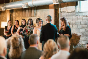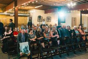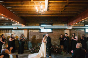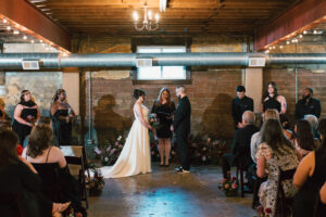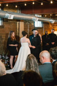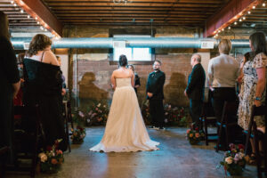 Finally, it was time for the group to hop on the shuttle and head to The WBU! It was the perfect venue for them – the industrial atmosphere created a cozy yet moody vibe for the entire day. The Copper Petal went all out and created a stunning floral meadow for the ceremony altar. Leah’s dad had unfortunately passed away a few years prior to the wedding (something that I can relate to that we bonded over), so they created a sweet tribute to him with a decorated chair in the front row. At last, The Connells were finally official!!!