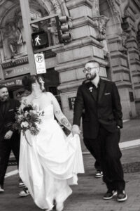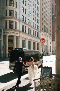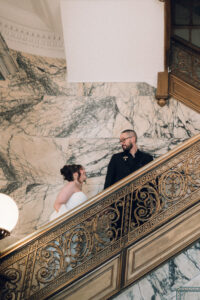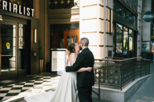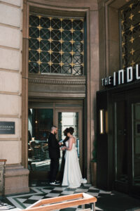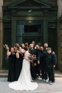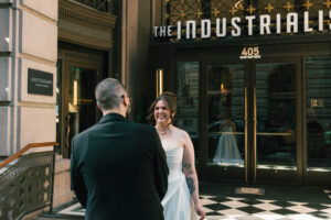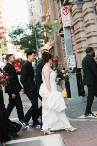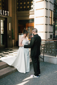 Time for the big reveal! They opted for a first look in front of the hotel, and I absolutely love the checkered floor and brass details in the background. The two shed lots of tears and read private vows. After touching up and taking a few portraits inside (taking advantage of the very cool marbling on the walls), they ventured around the block with their wedding party. I LOVE a good crosswalk shot, and the whole group nailed it.