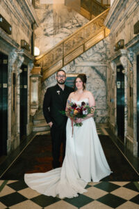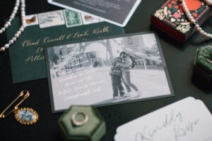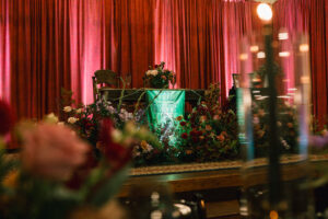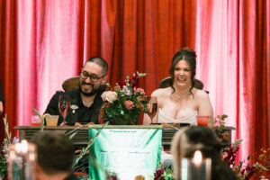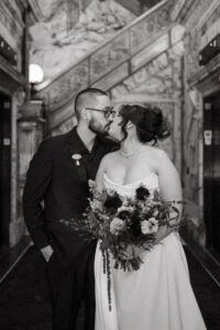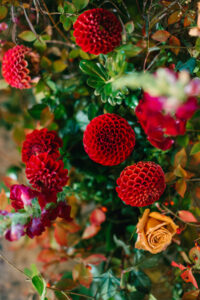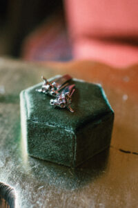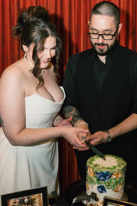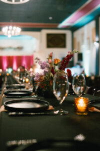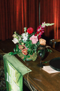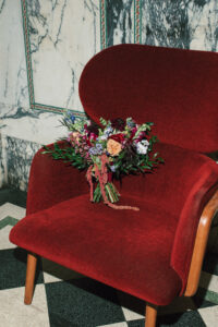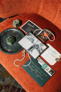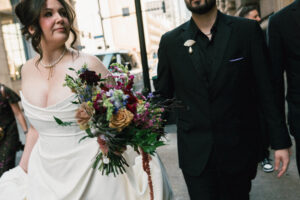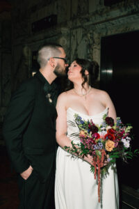 Leah + Chad’s gorgeously moody, vintage-inspired October wedding was definitely an Afternoon Media all-time favorite. Every detail was planned super intentionally – even down to the napkins! The day was both elevated and eclectic, incorporating jewel tones, funky florals, and velvet textures. I love when my couples consider every single detail and create a day that really reflects them – not just what they think a wedding should be.