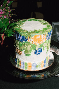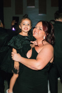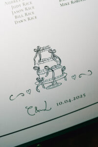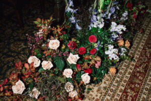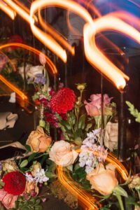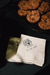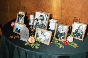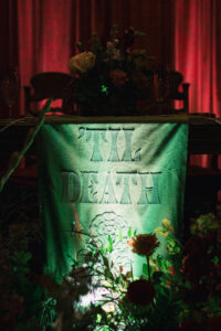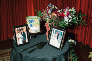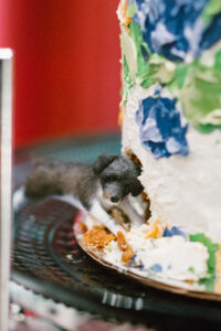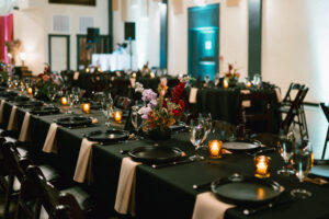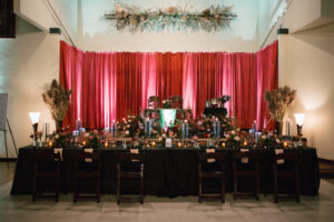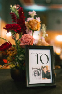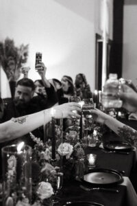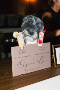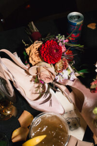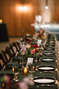 The reception space was STUNNING – a total culmination of the day’s visual feel. Each guest table was decked out with flowers, which popped against the all-black linens and tableware. The table numbers had photos of L + C at their corresponding ages, which I always love to see. My favorite part personally was the sweetheart table, which had its own floral meadow and a very cool “Til Death” velvet banner. They even included several touches featuring their pup, Gizmo (looks like he enjoyed the cake, hehehe)!