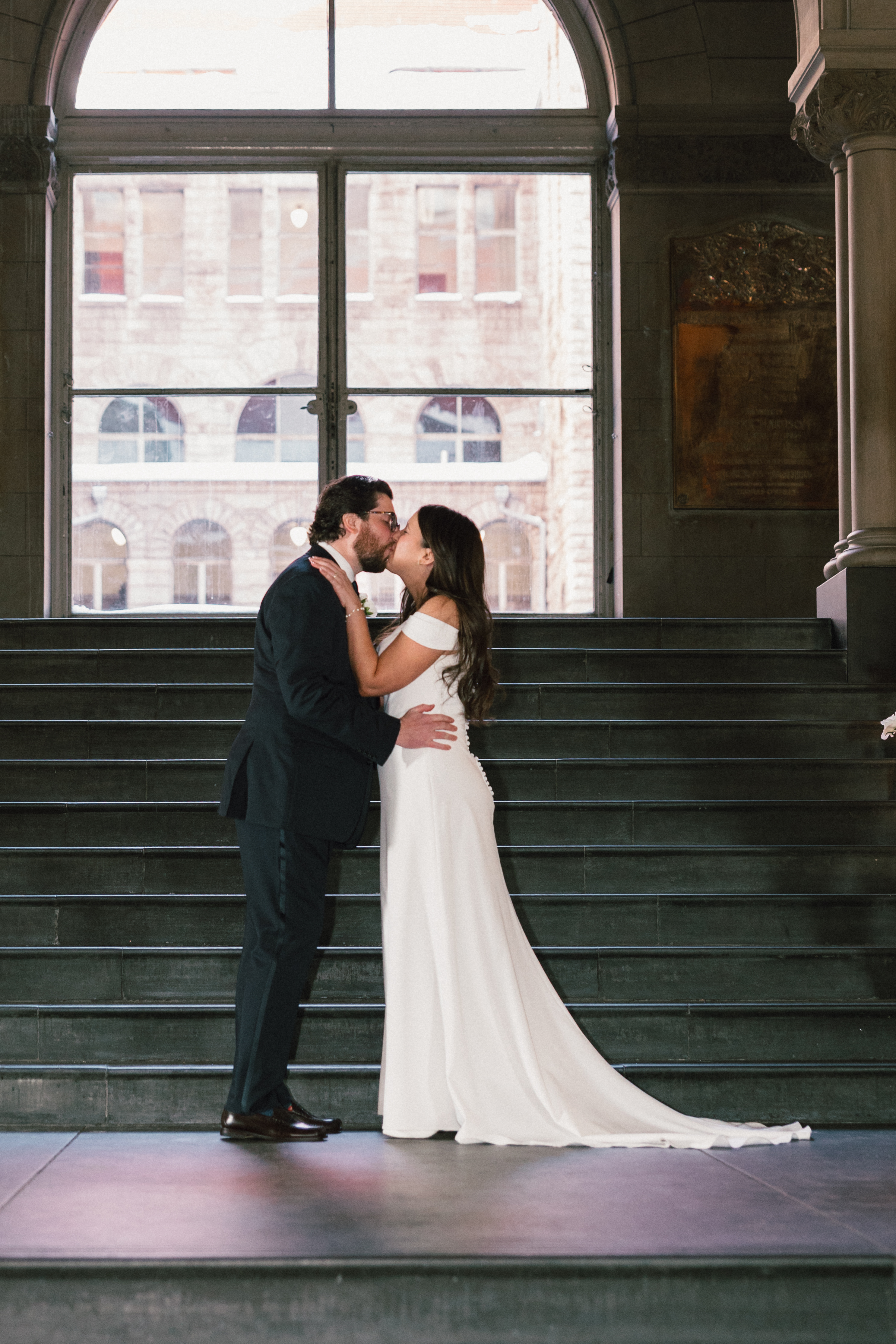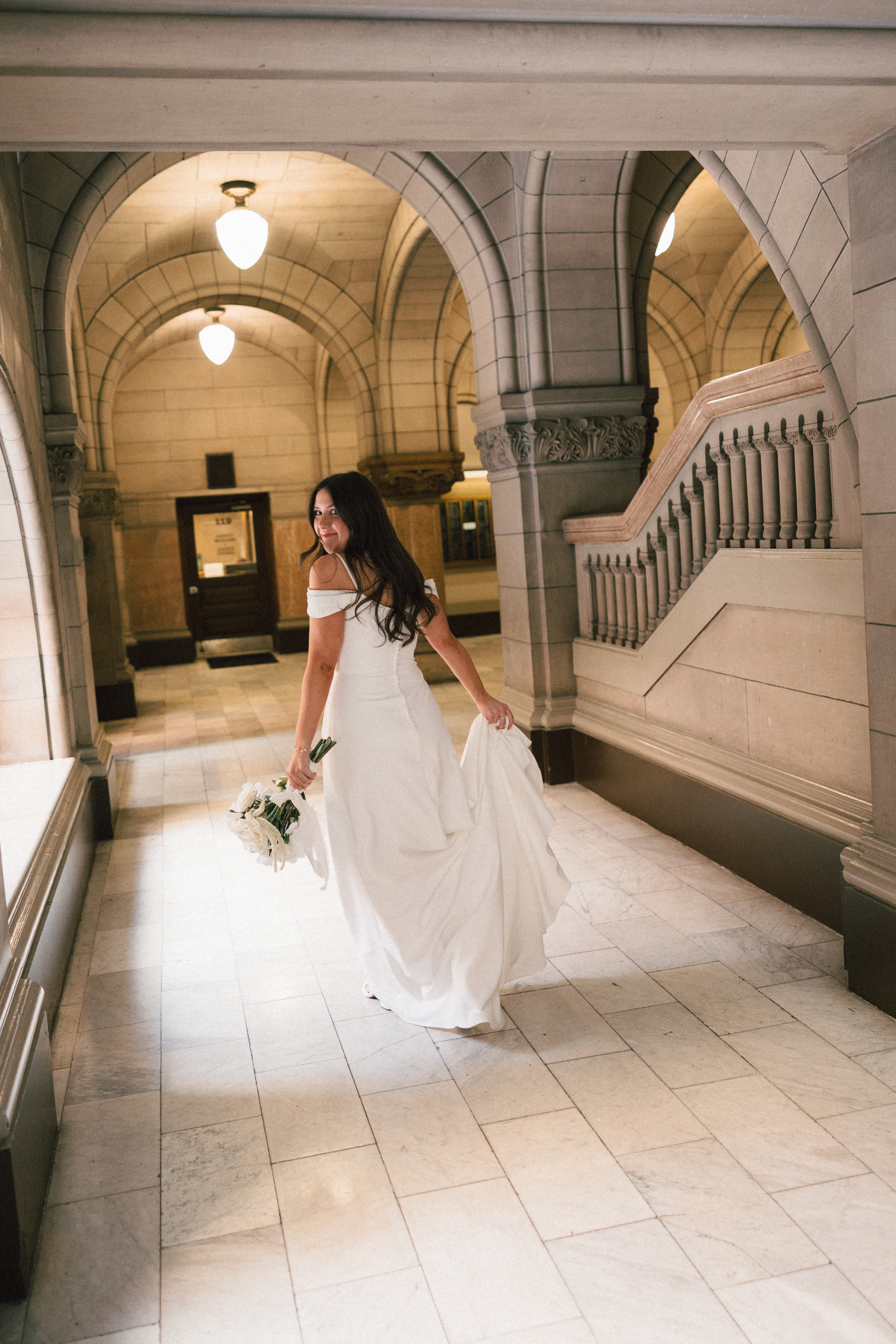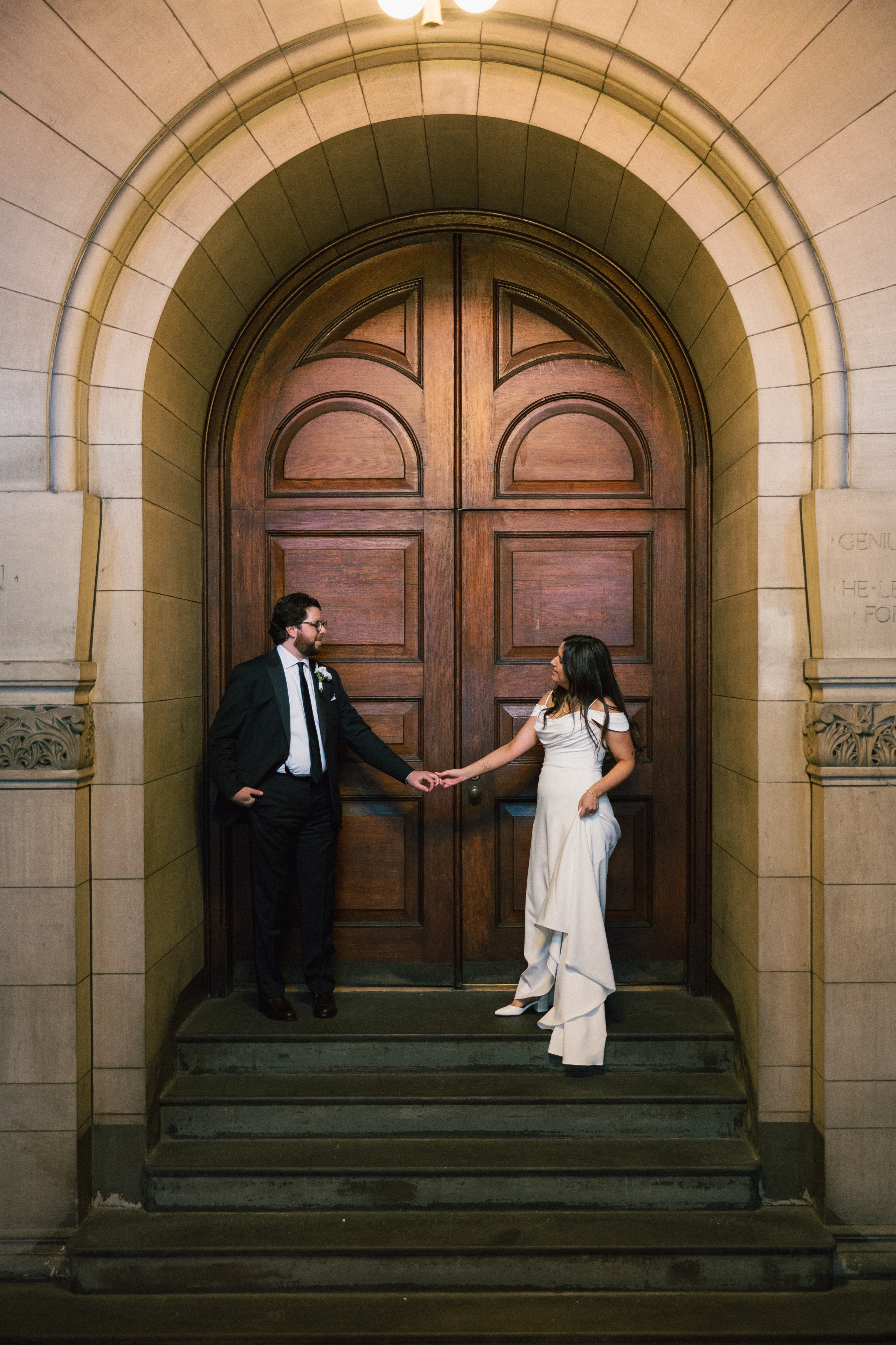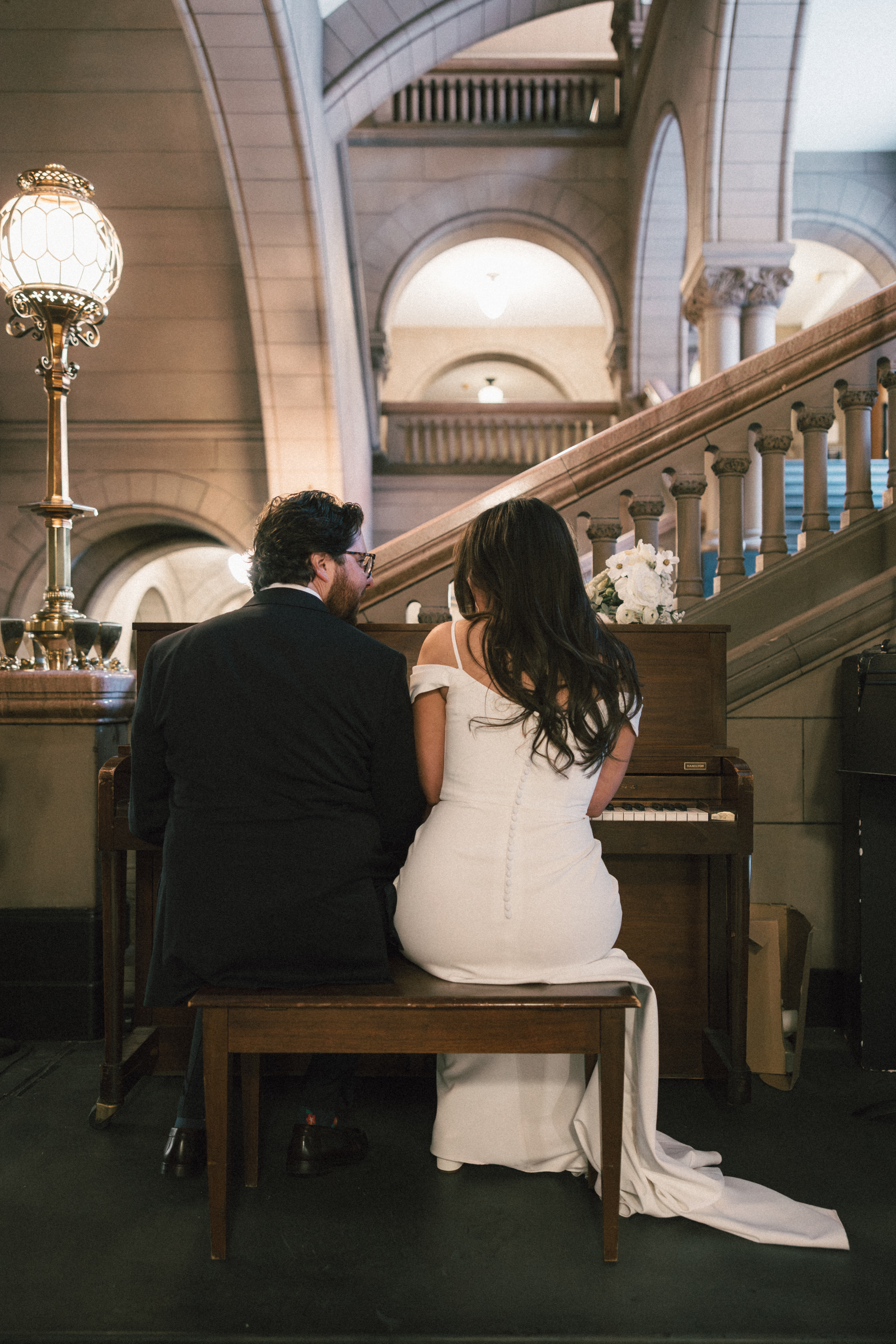 After exchanging personally written vows and rings, it was official! We snapped a few family portraits and finally had the courthouse to ourselves for some alone time. Hannah + Michael wanted as many portraits as possible, so we took our time exploring the courthouse architecture, playing piano, and laughing it up. One of my personal favorite spots is in front of the giant wooden doors on the third floor. It’s super dramatic and really encapsulates the courthouse vibe of it all!