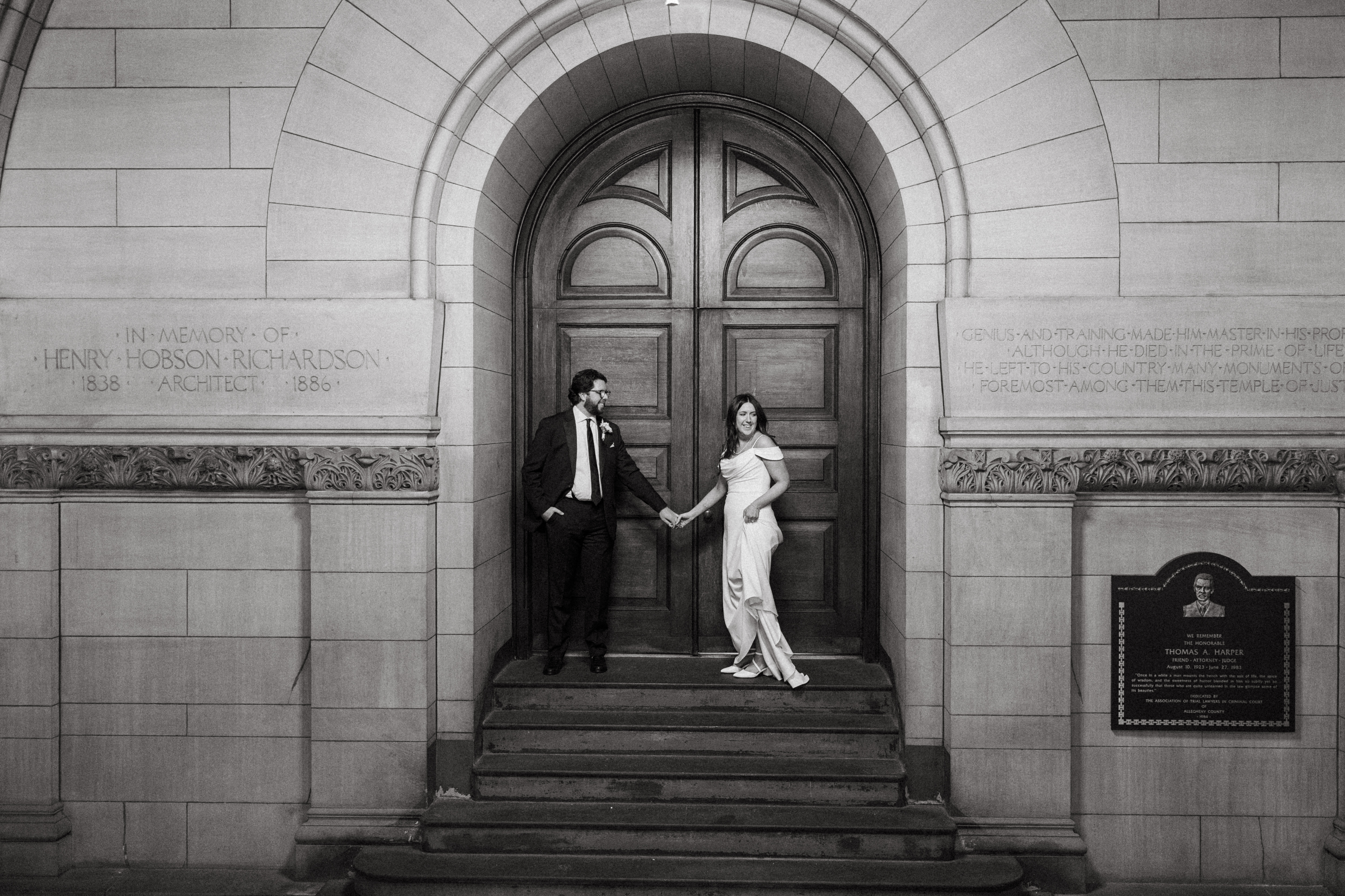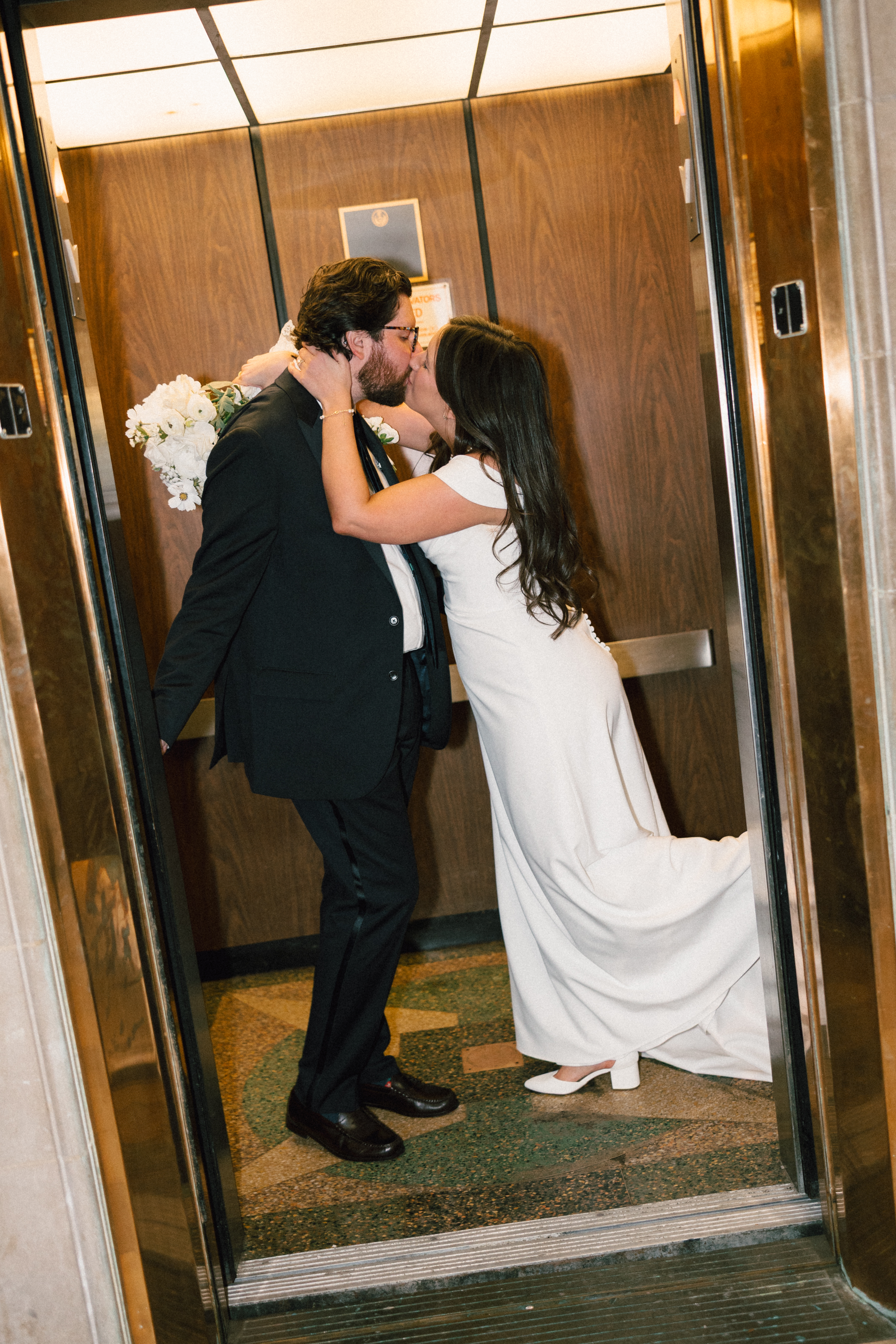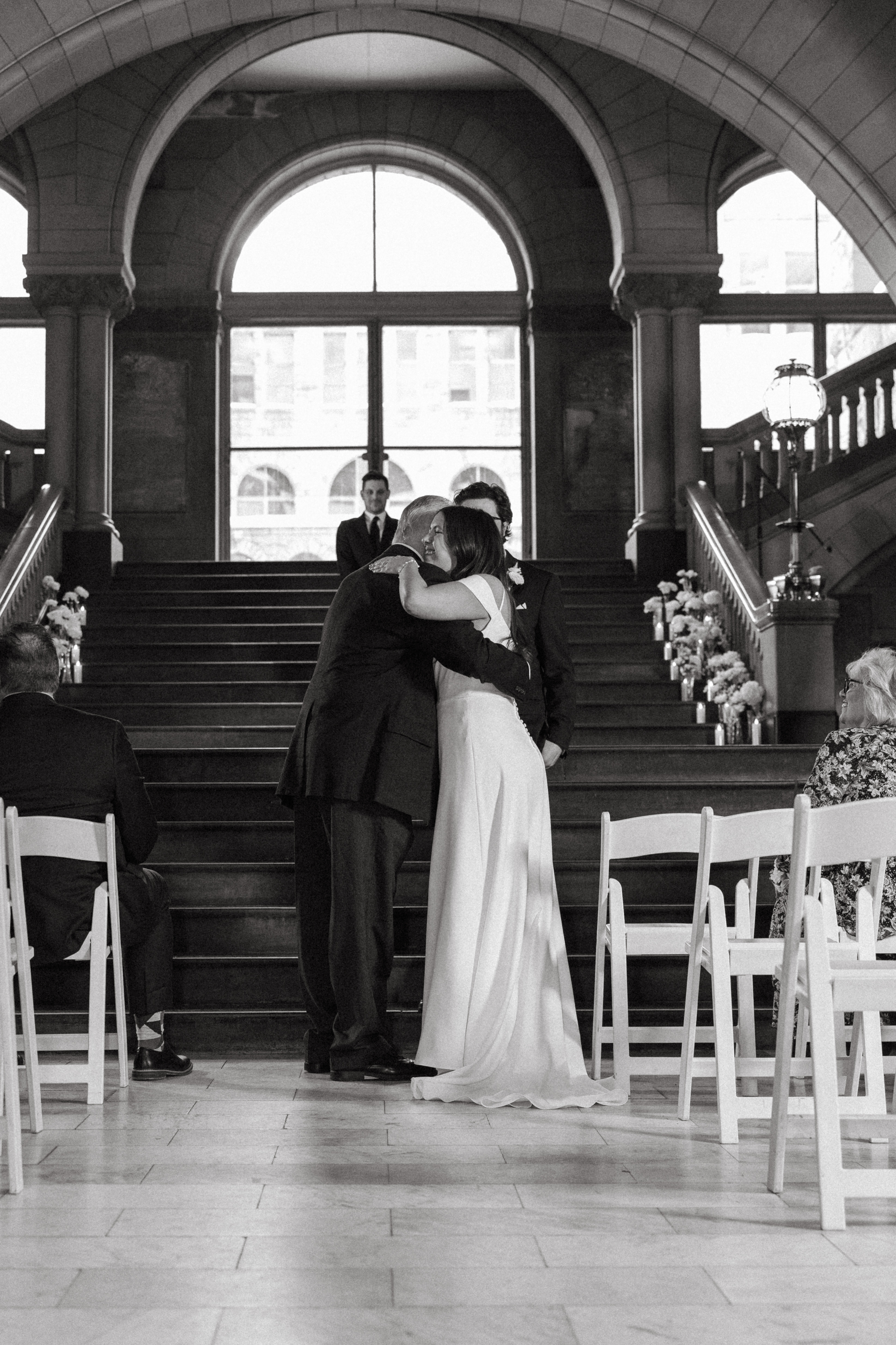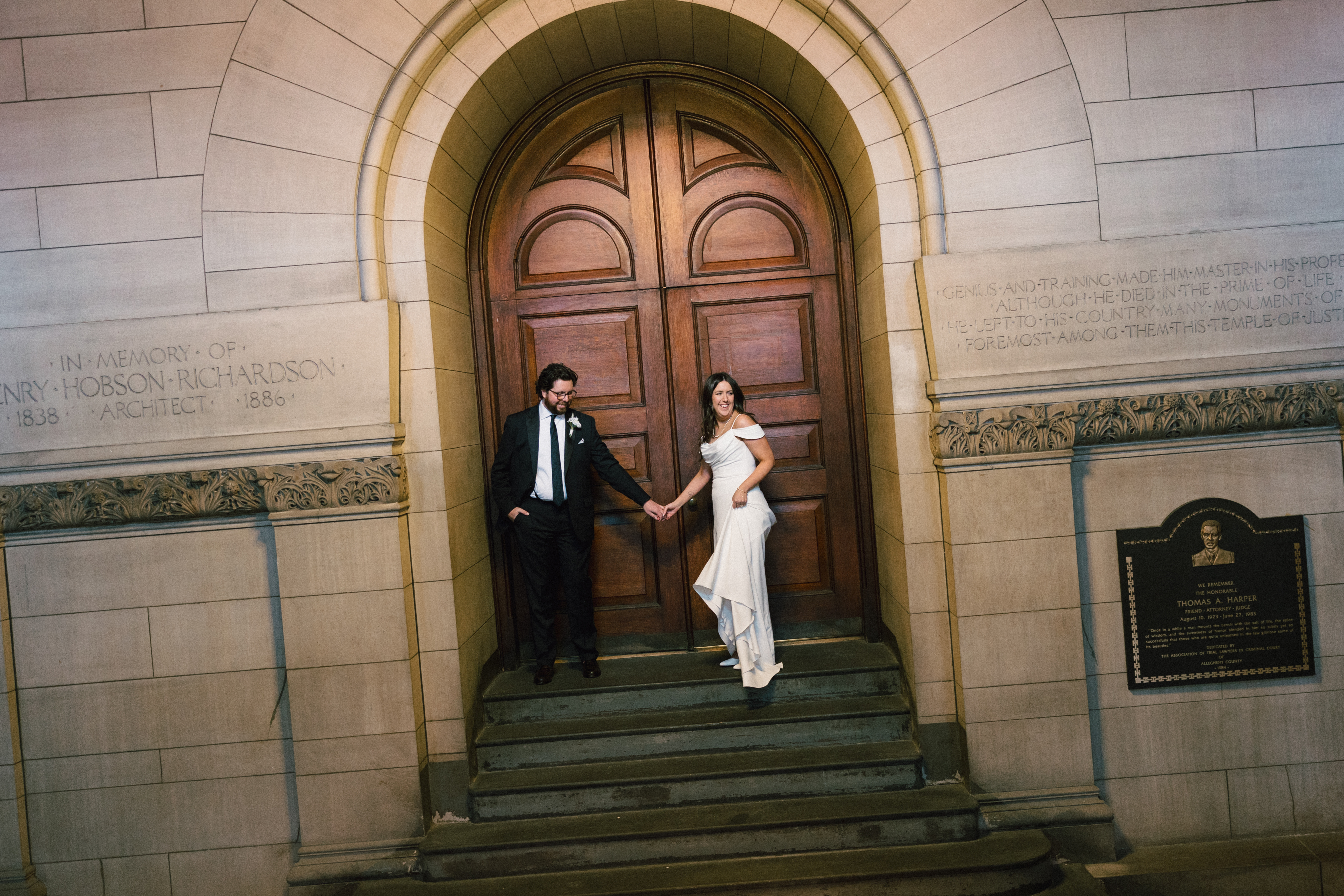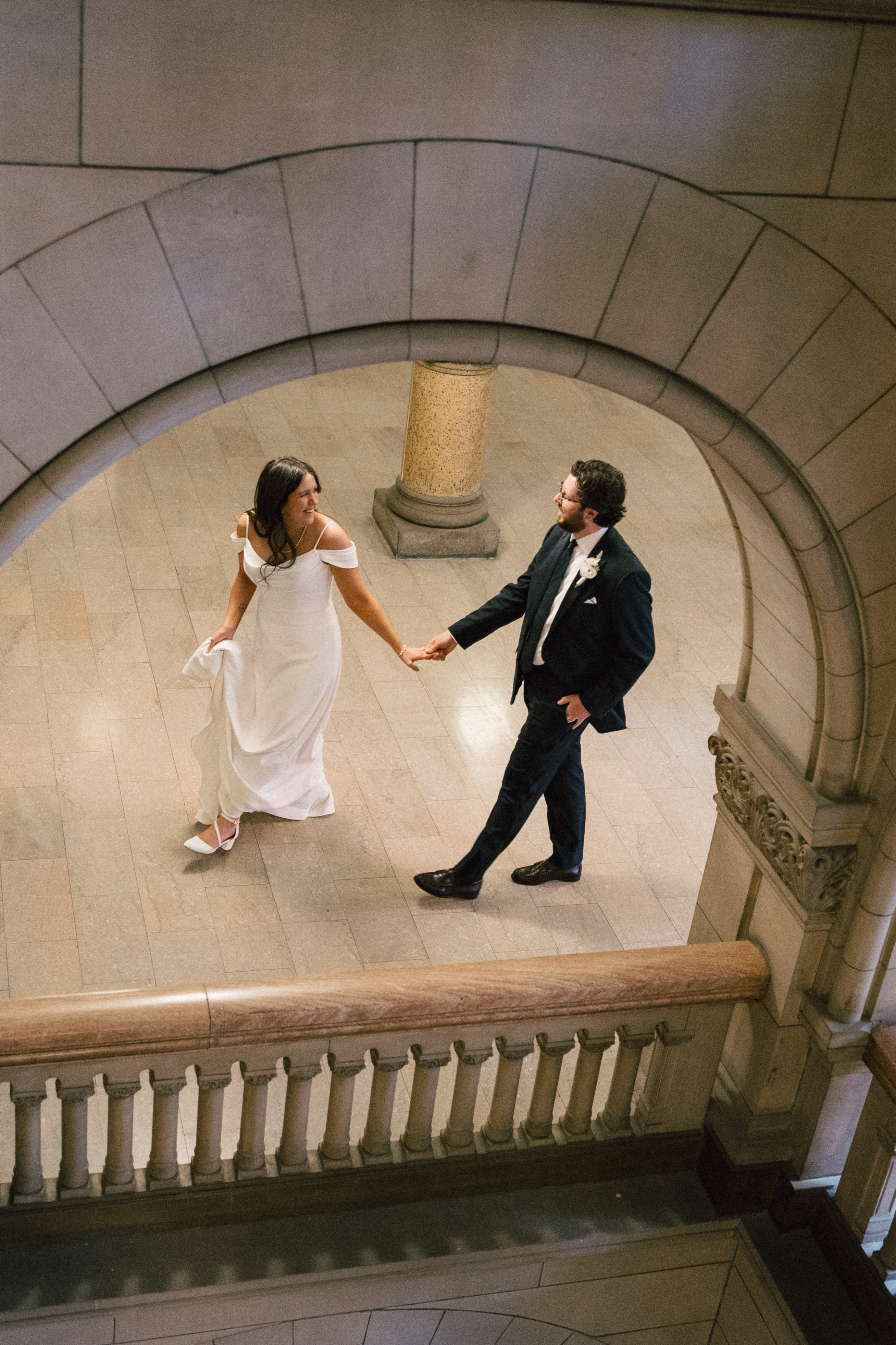 After exchanging personally written vows and rings, it was official! We snapped a few family portraits and finally had the courthouse to ourselves for some alone time. Hannah + Michael wanted as many portraits as possible, so we took our time exploring the courthouse architecture, playing piano, and laughing it up. One of my personal favorite spots is in front of the giant wooden doors on the third floor. It’s super dramatic and really encapsulates the courthouse vibe of it all!
