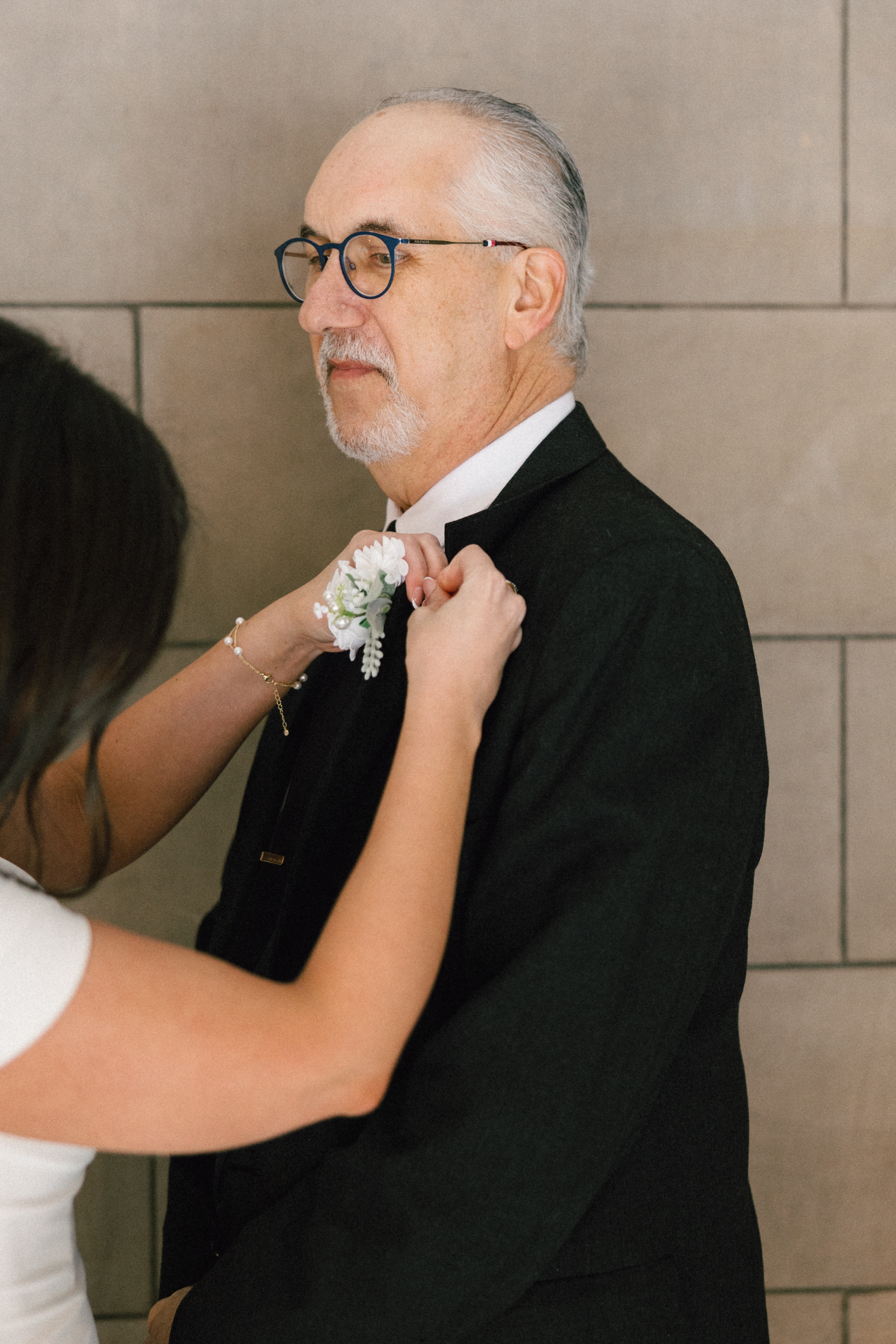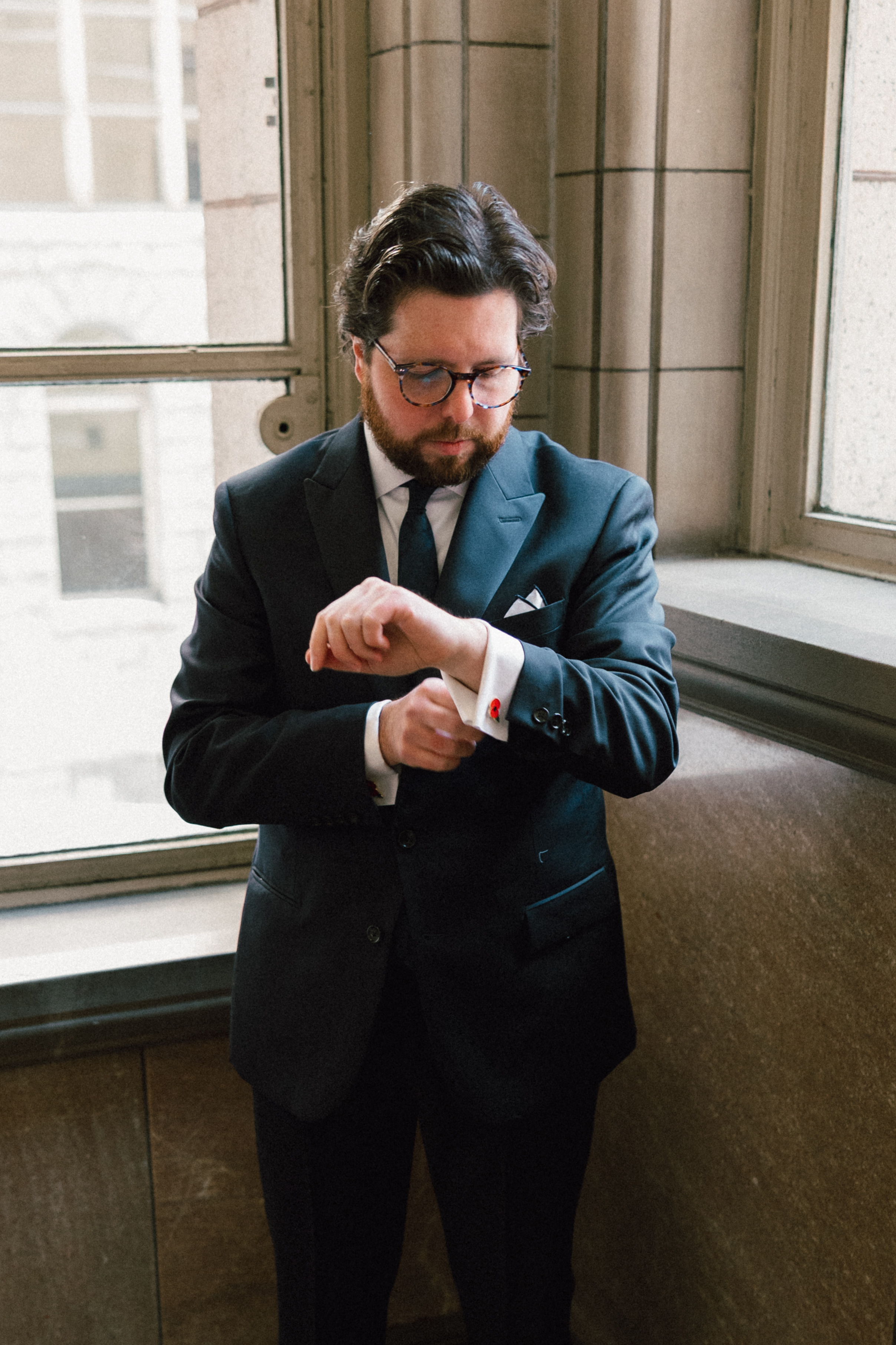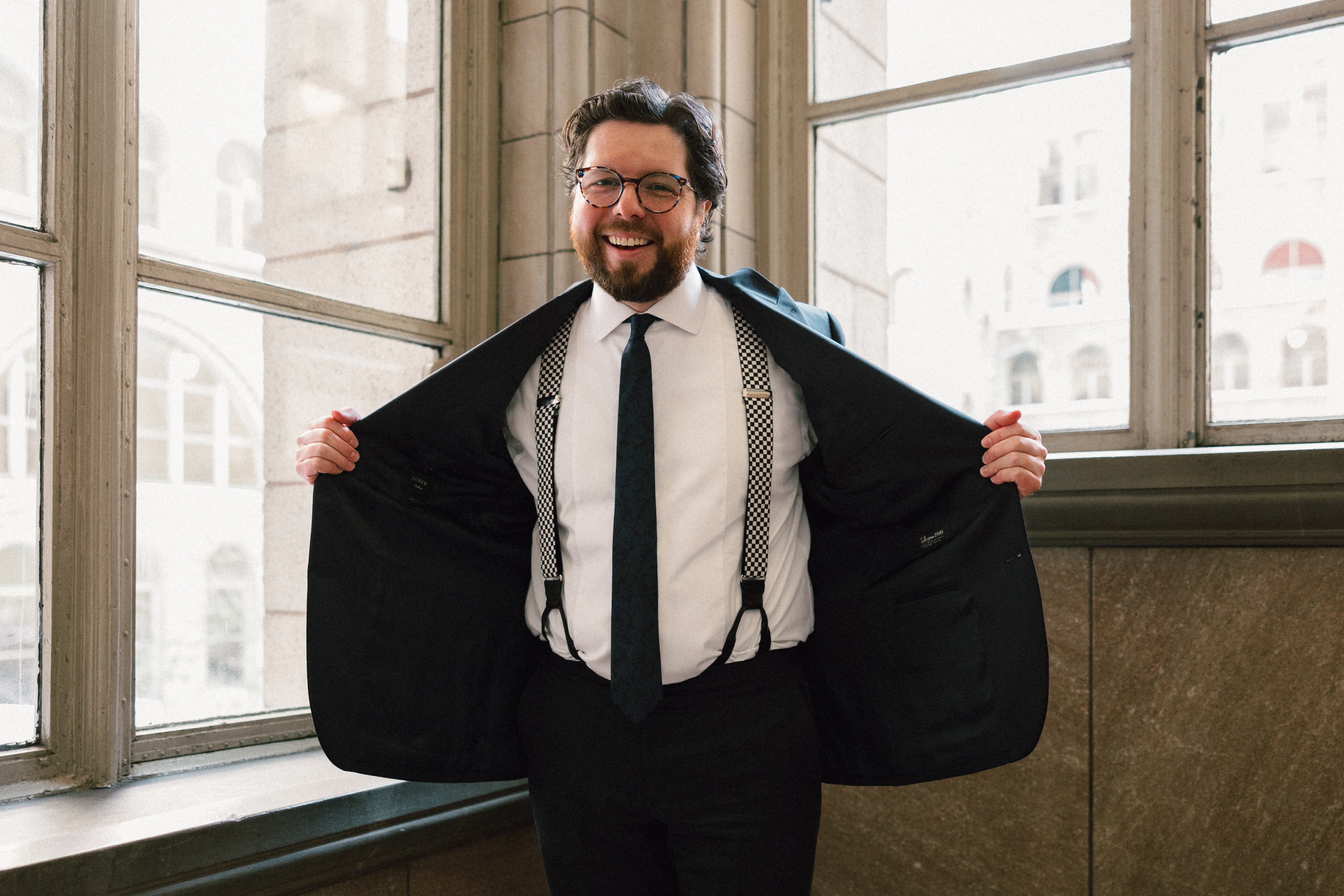 Hannah’s mom and sister helped put on some finishing touches, including her pearly veil and matching pearl necklace. Her dress was beautifully modern and minimalistic – an amazing find from my friends at Bridal Maven. She even DIY’ed all the faux florals! Michael donned a navy suit + tie with sweet poppy cufflinks and a checkered suspender surprise. In his words, “We’re bringing back ska!”