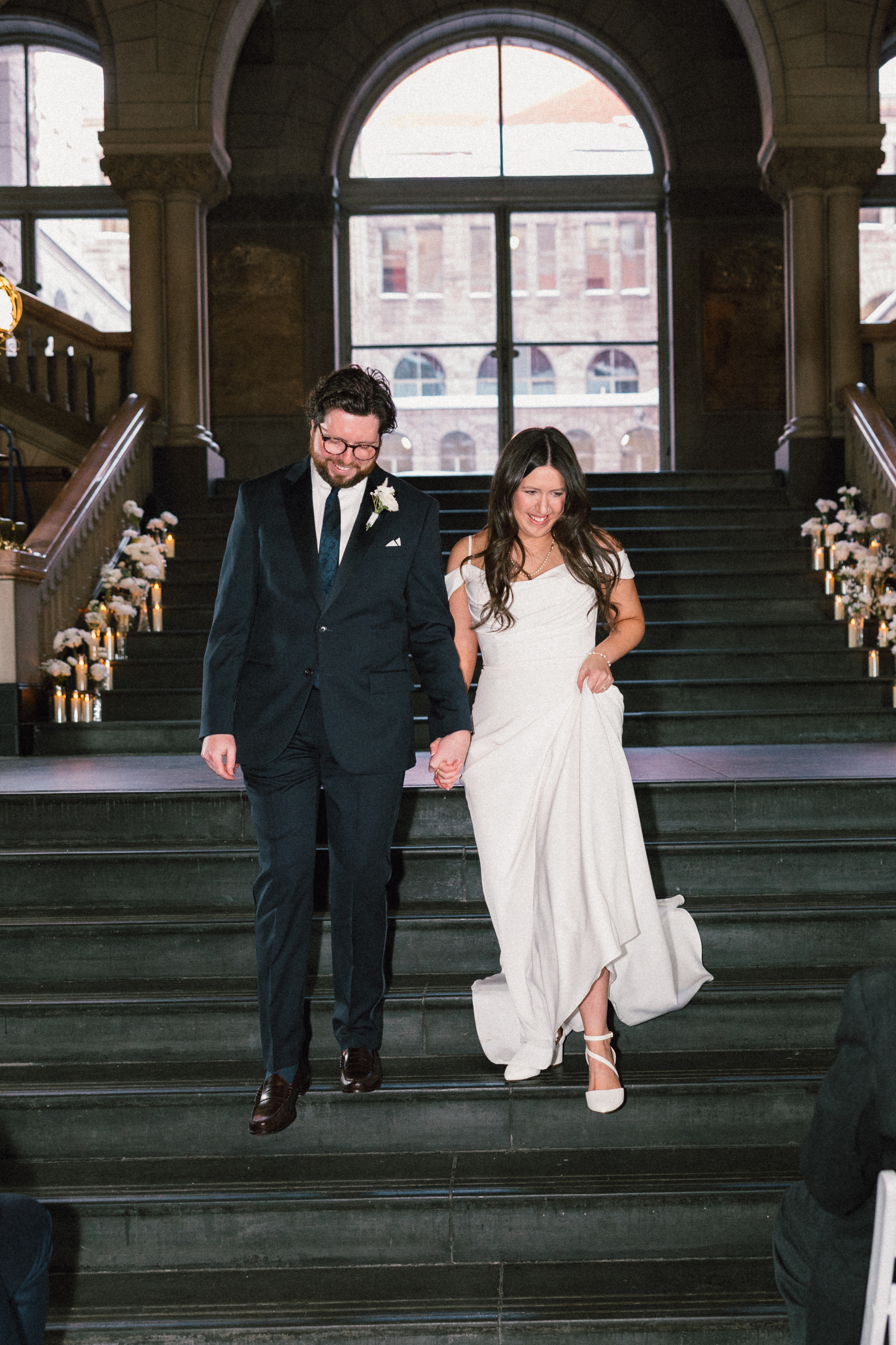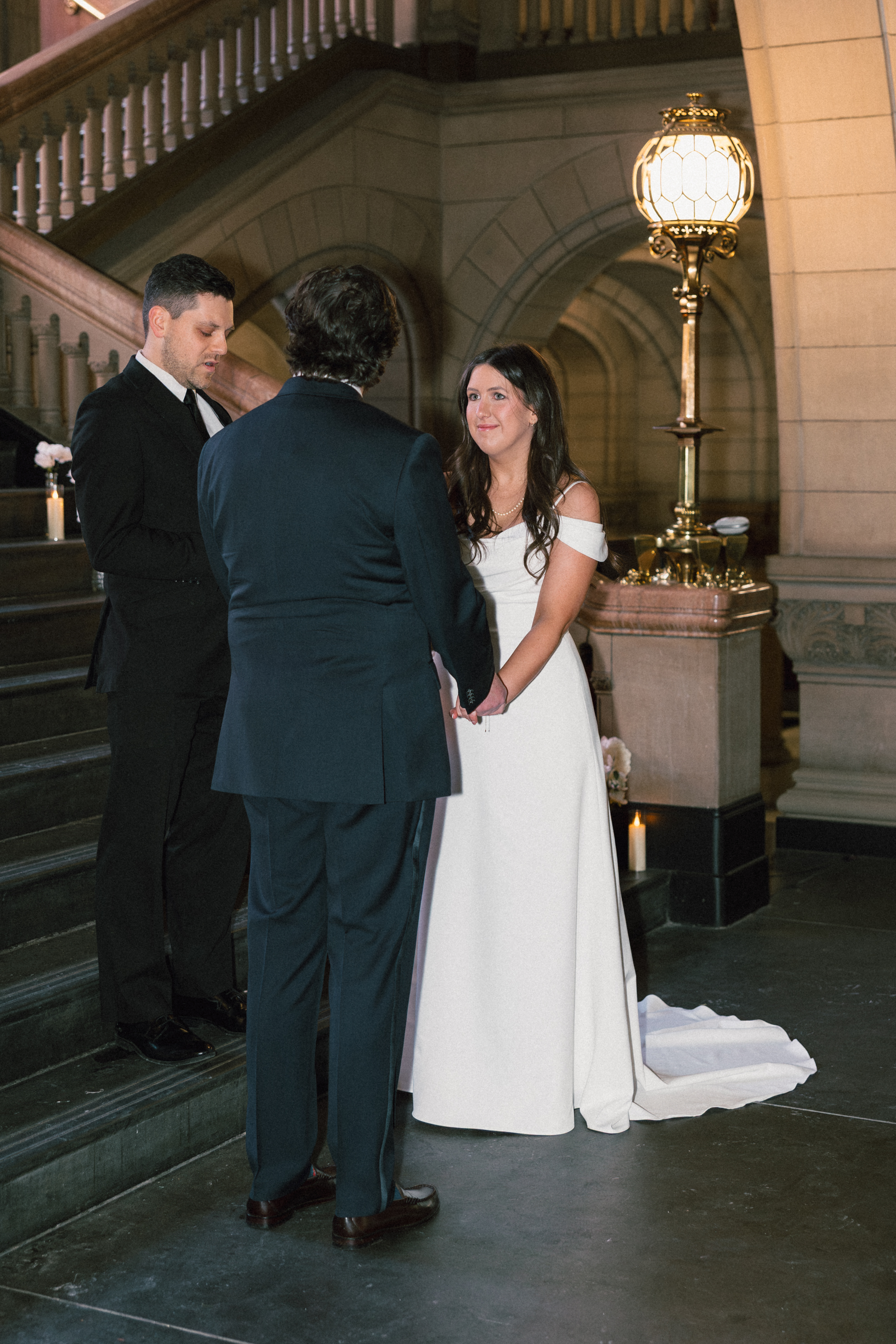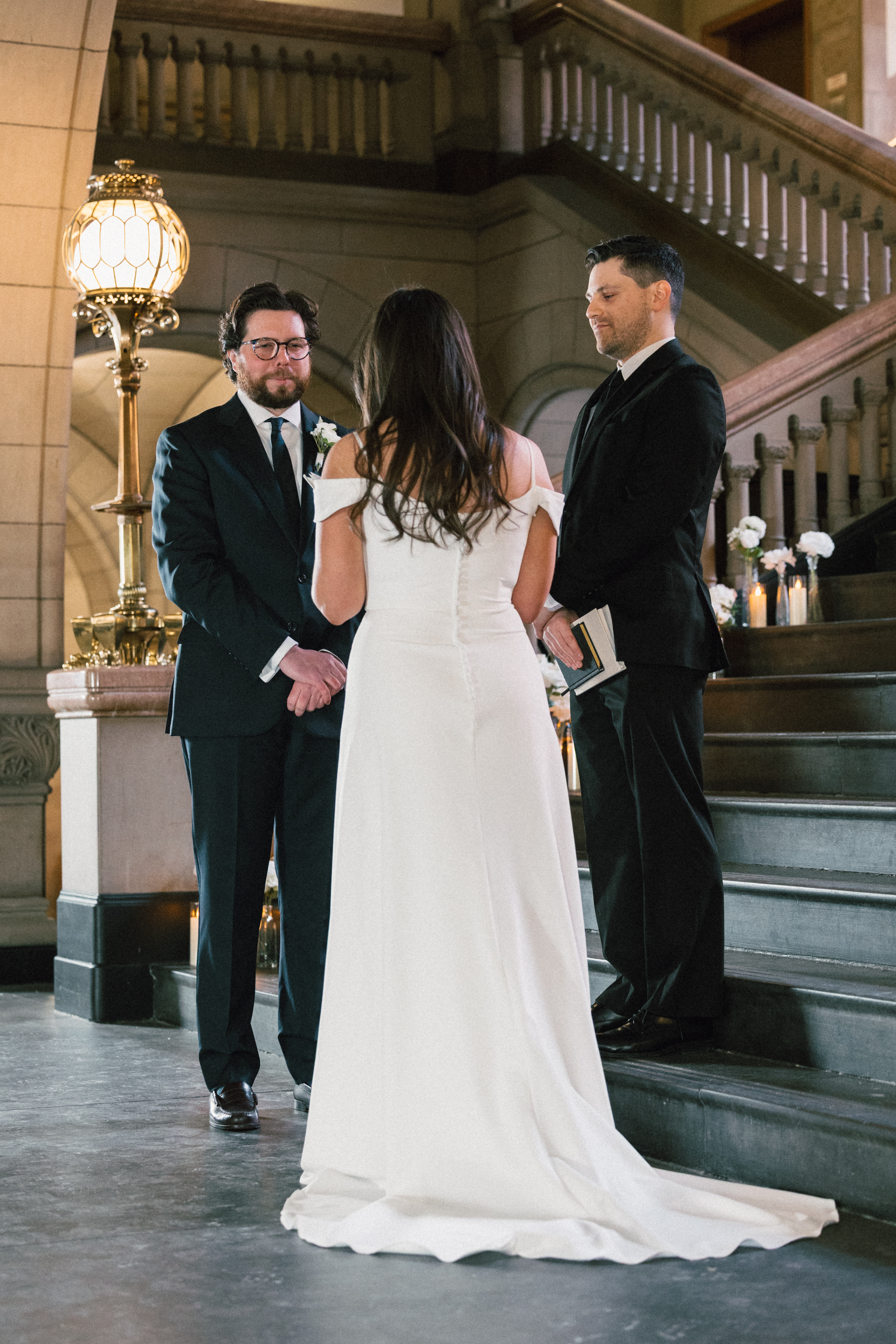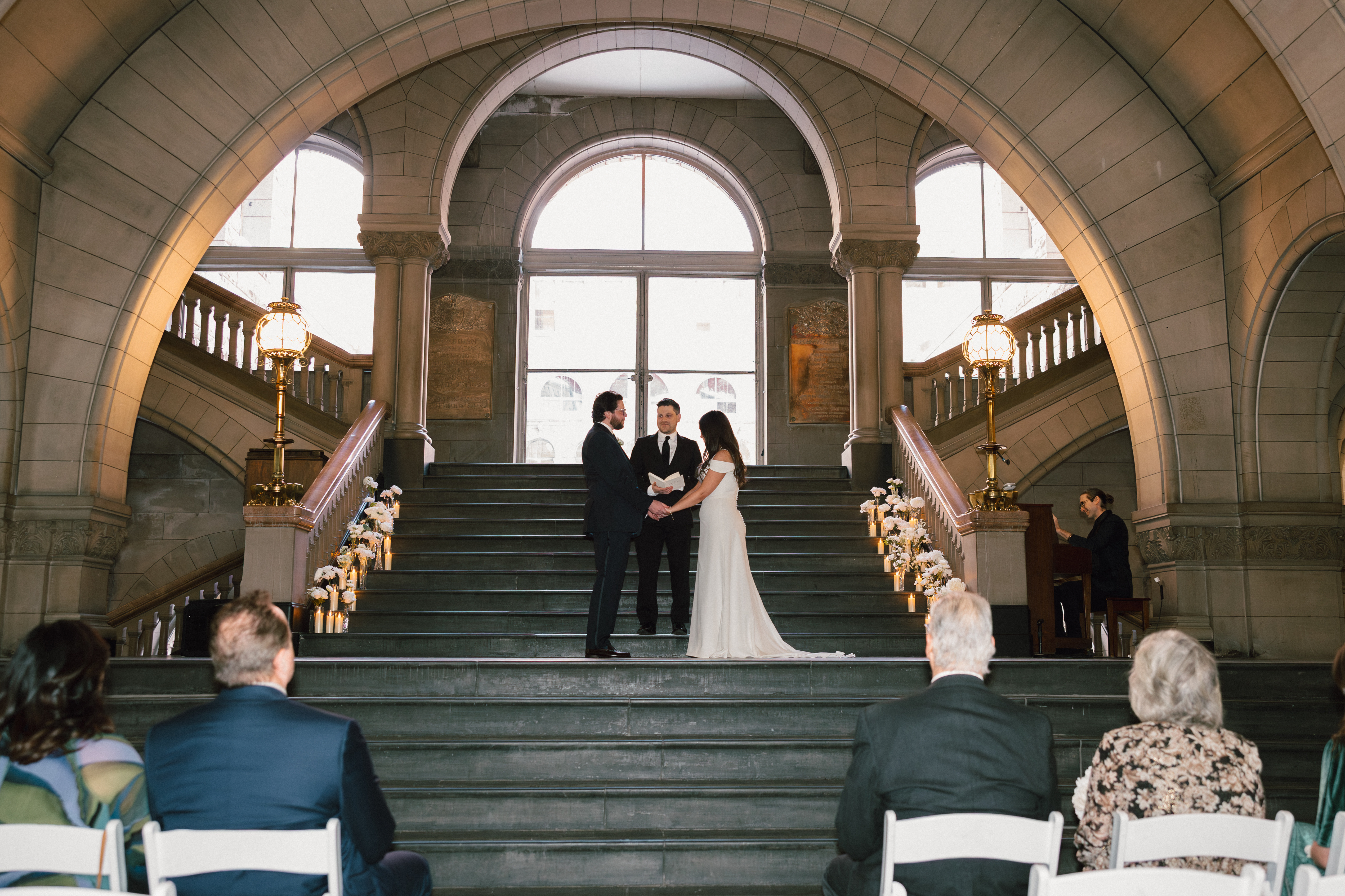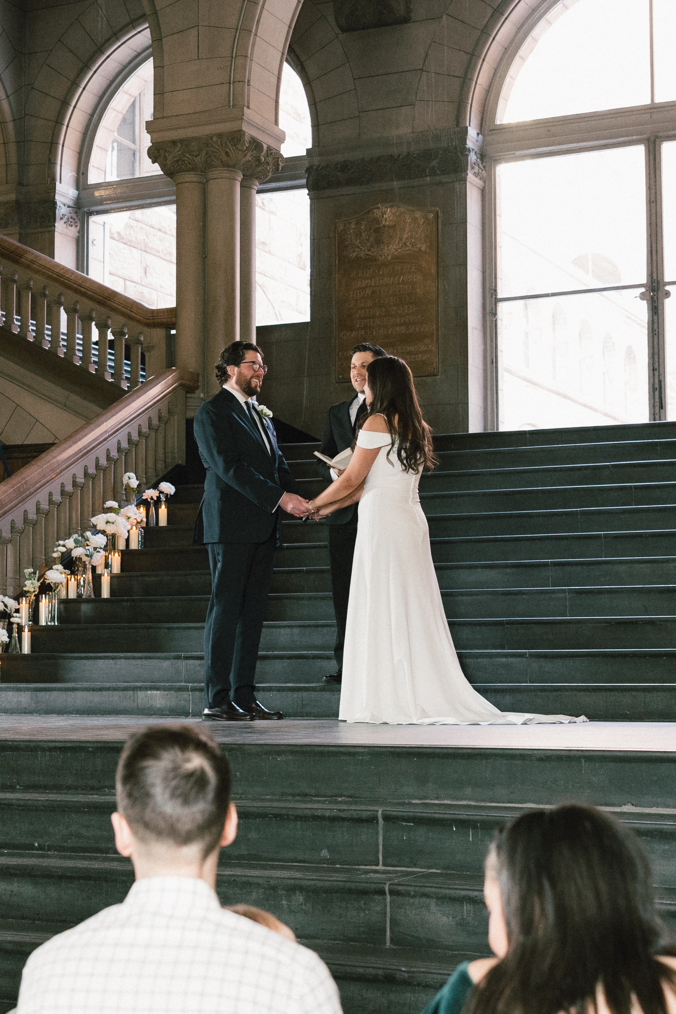At last, it was time for the ceremony to begin! The grand staircase of the courthouse was decorated with bud vases and candles, which created such a warm and cozy ambience. Their friend provided the music, playing “I Will Follow You Into the Dark” by Death Cab for Cutie on piano as Hannah and Michael walked down the aisle.
