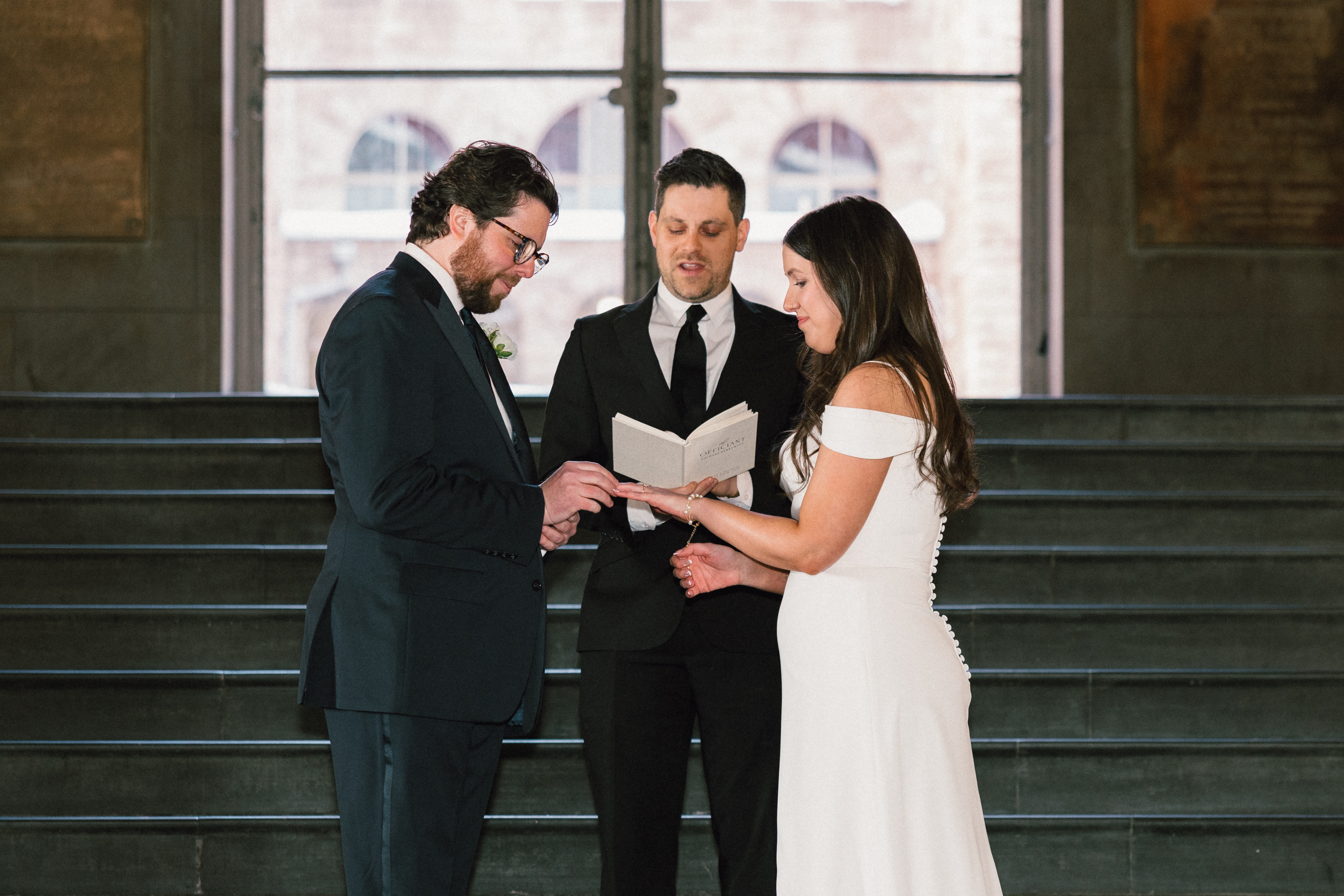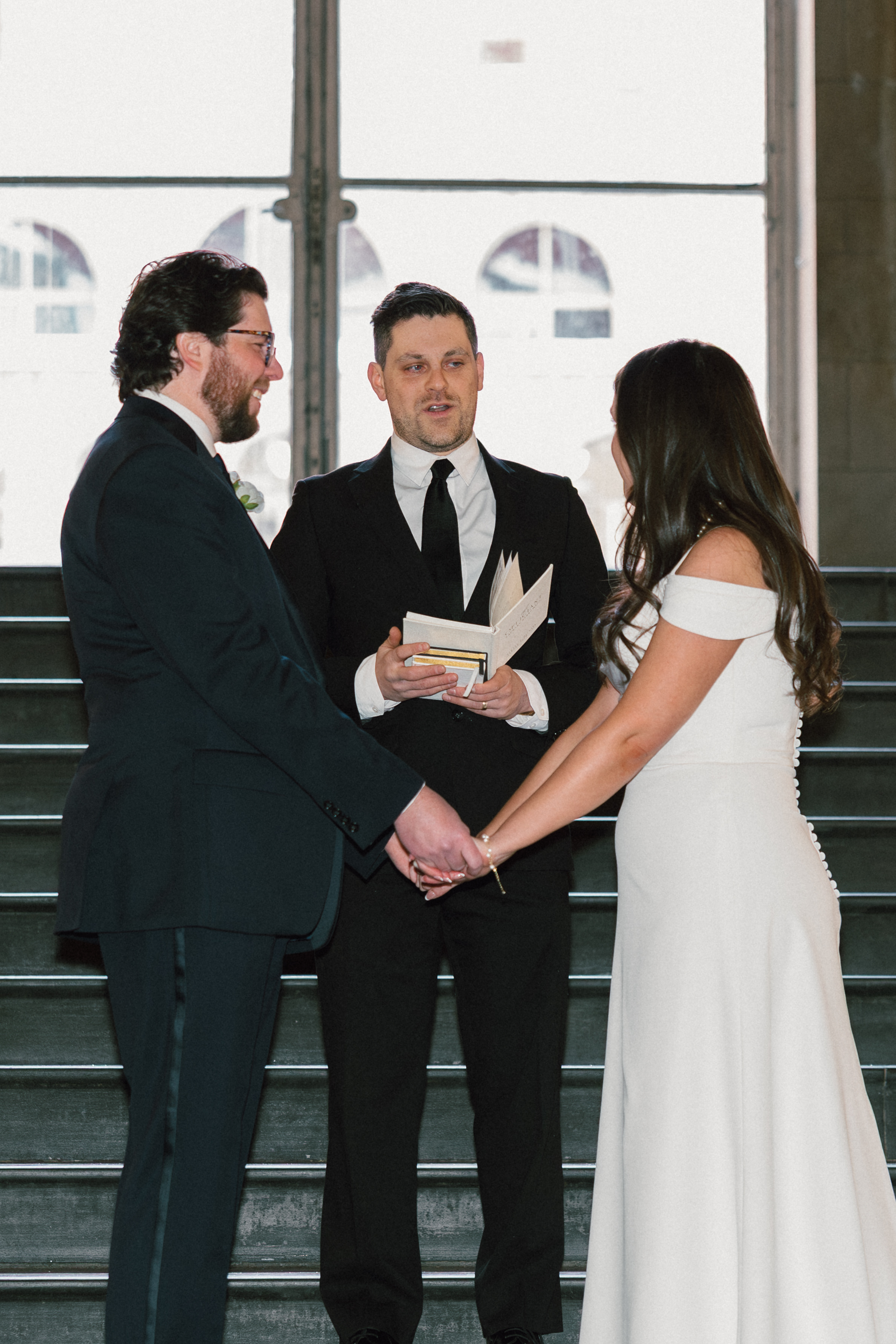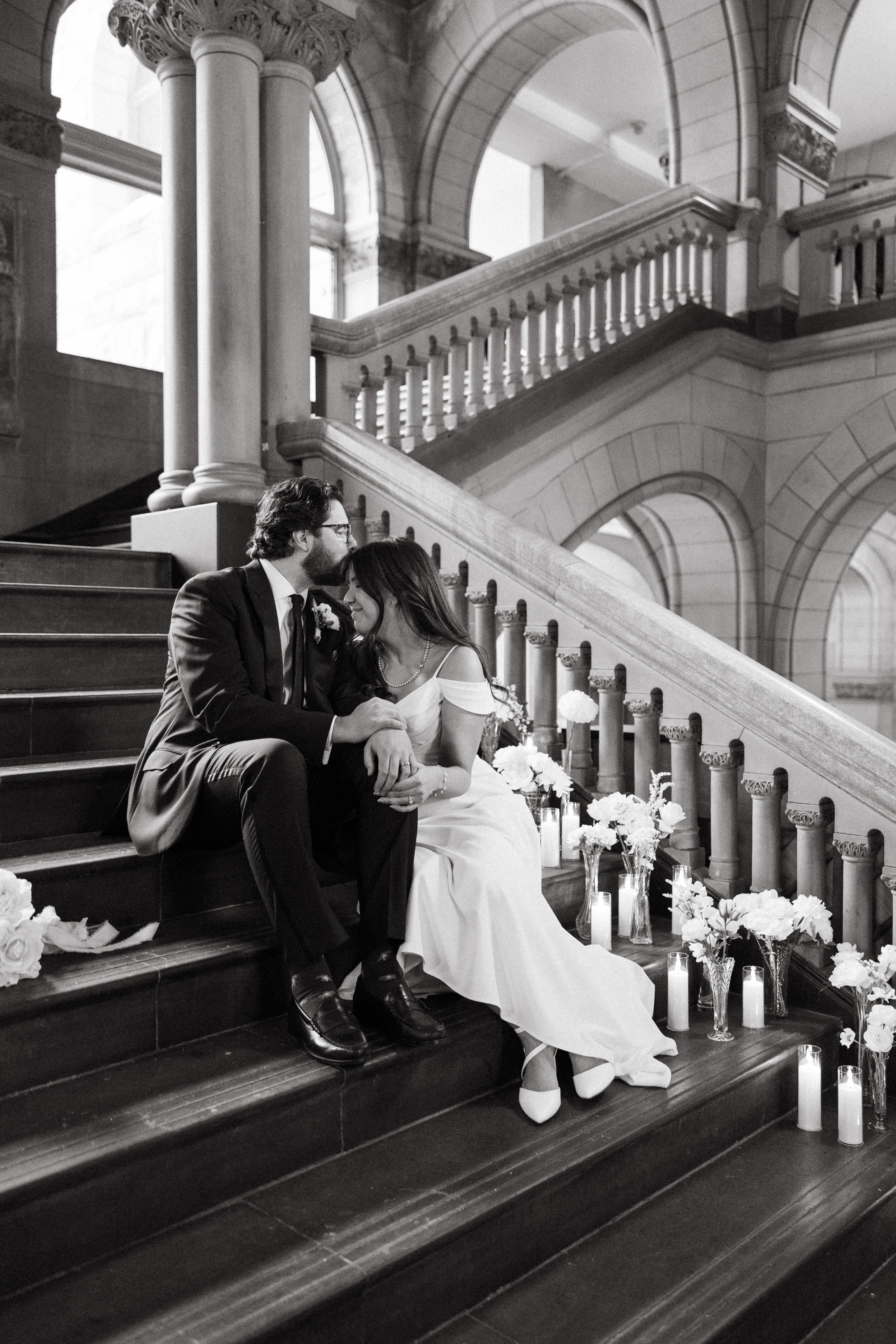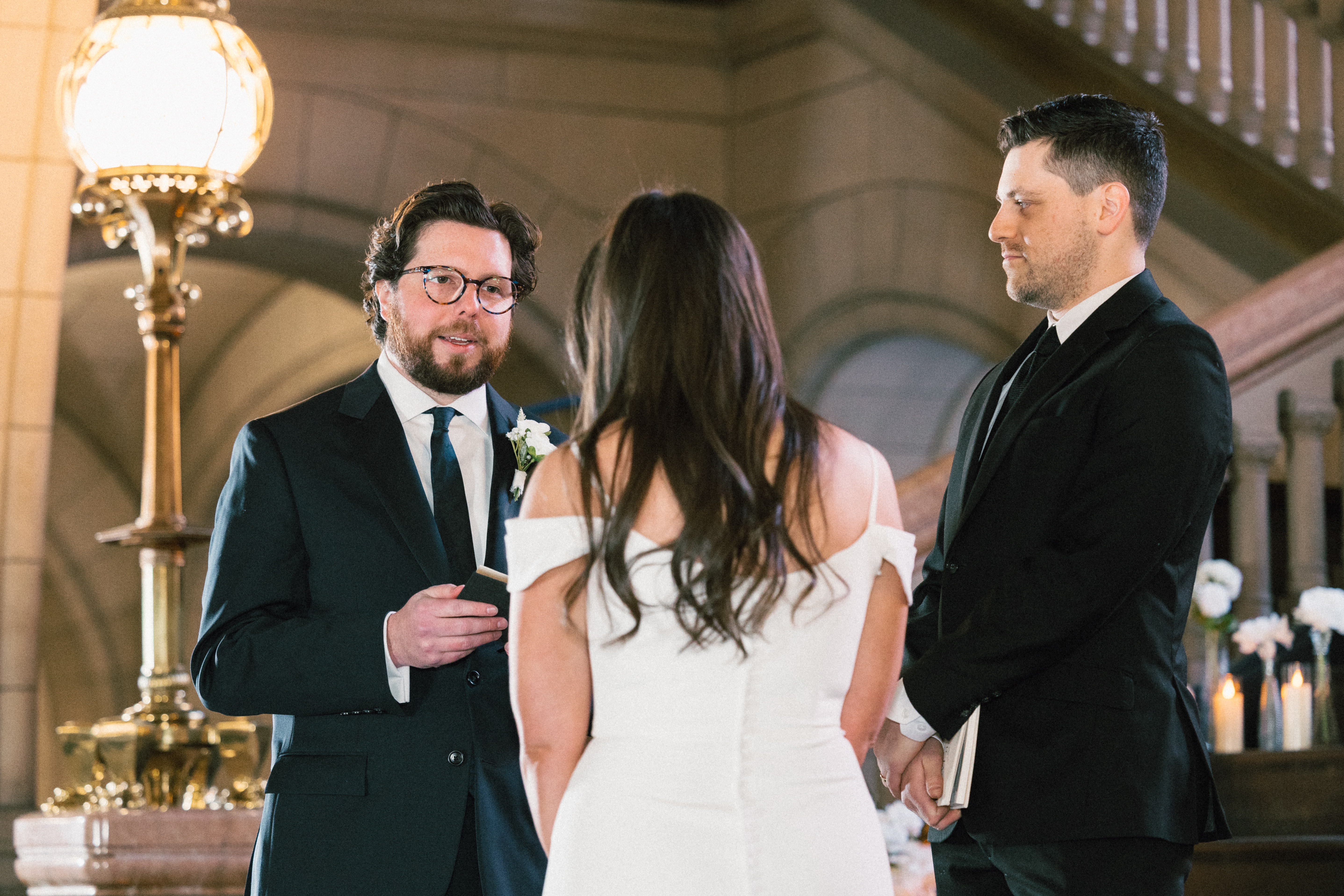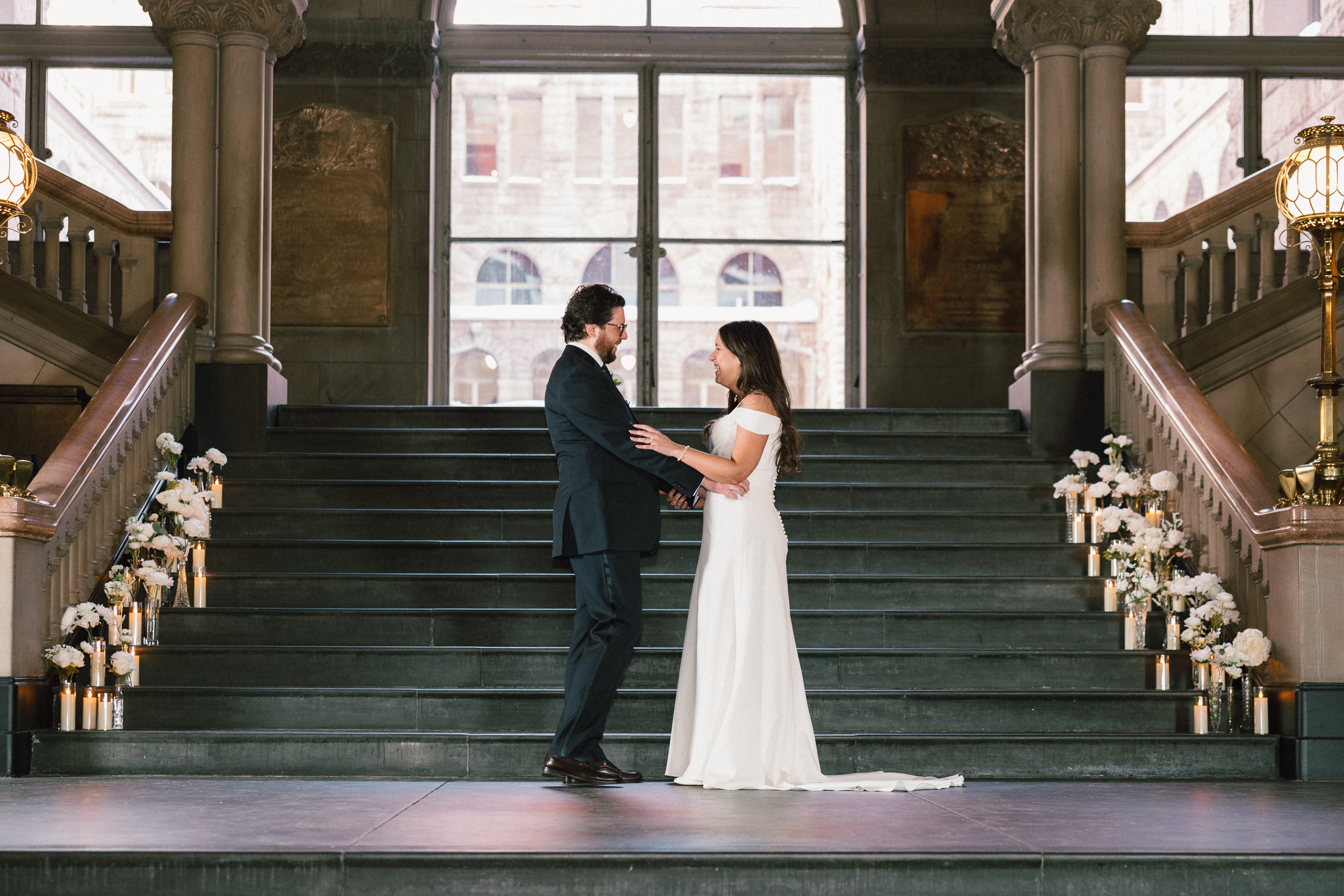 At last, it was time for the ceremony to begin! The grand staircase of the courthouse was decorated with bud vases and candles, which created such a warm and cozy ambience. Their friend provided the music, playing “I Will Follow You Into the Dark” by Death Cab for Cutie on piano as Hannah and Michael walked down the aisle.