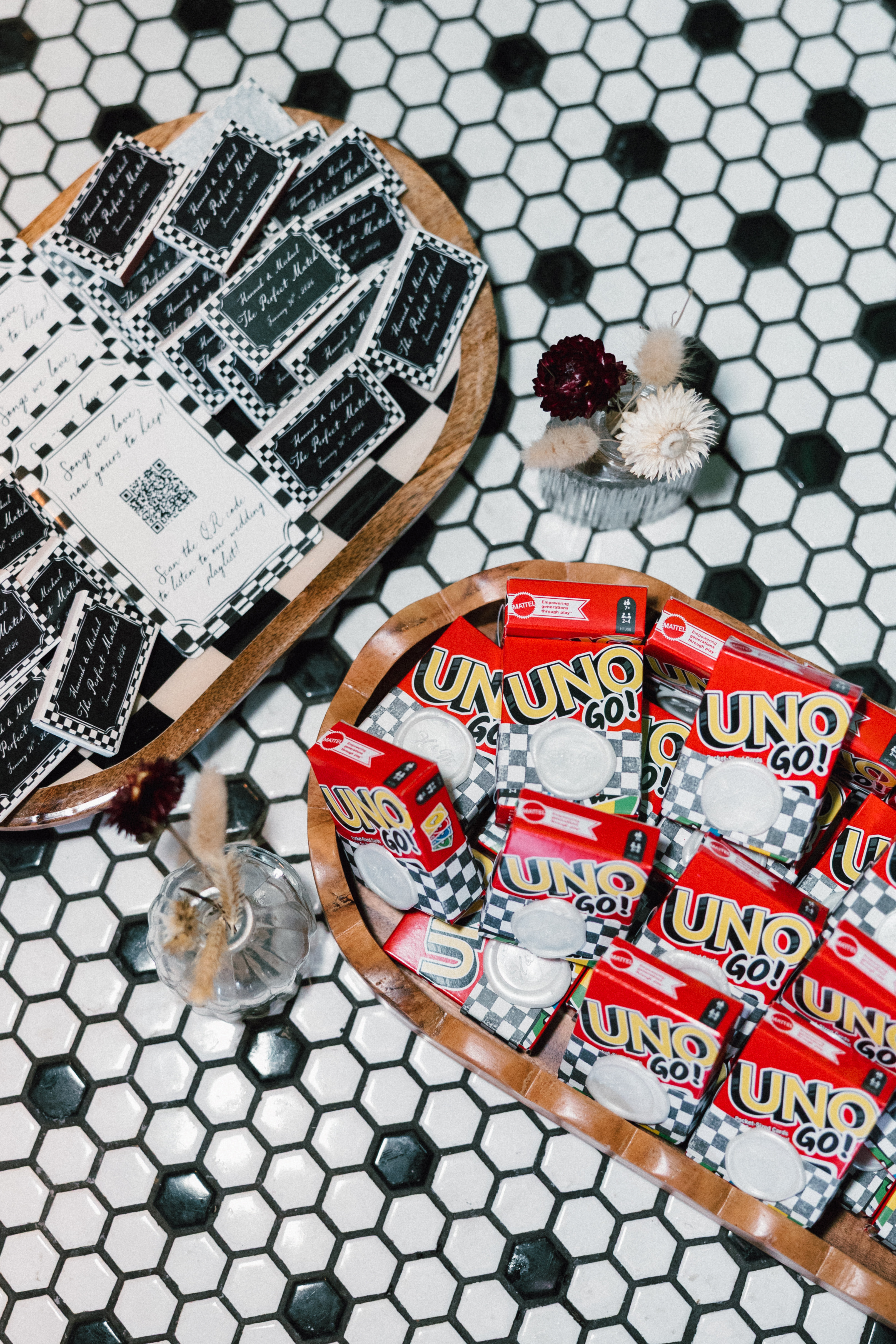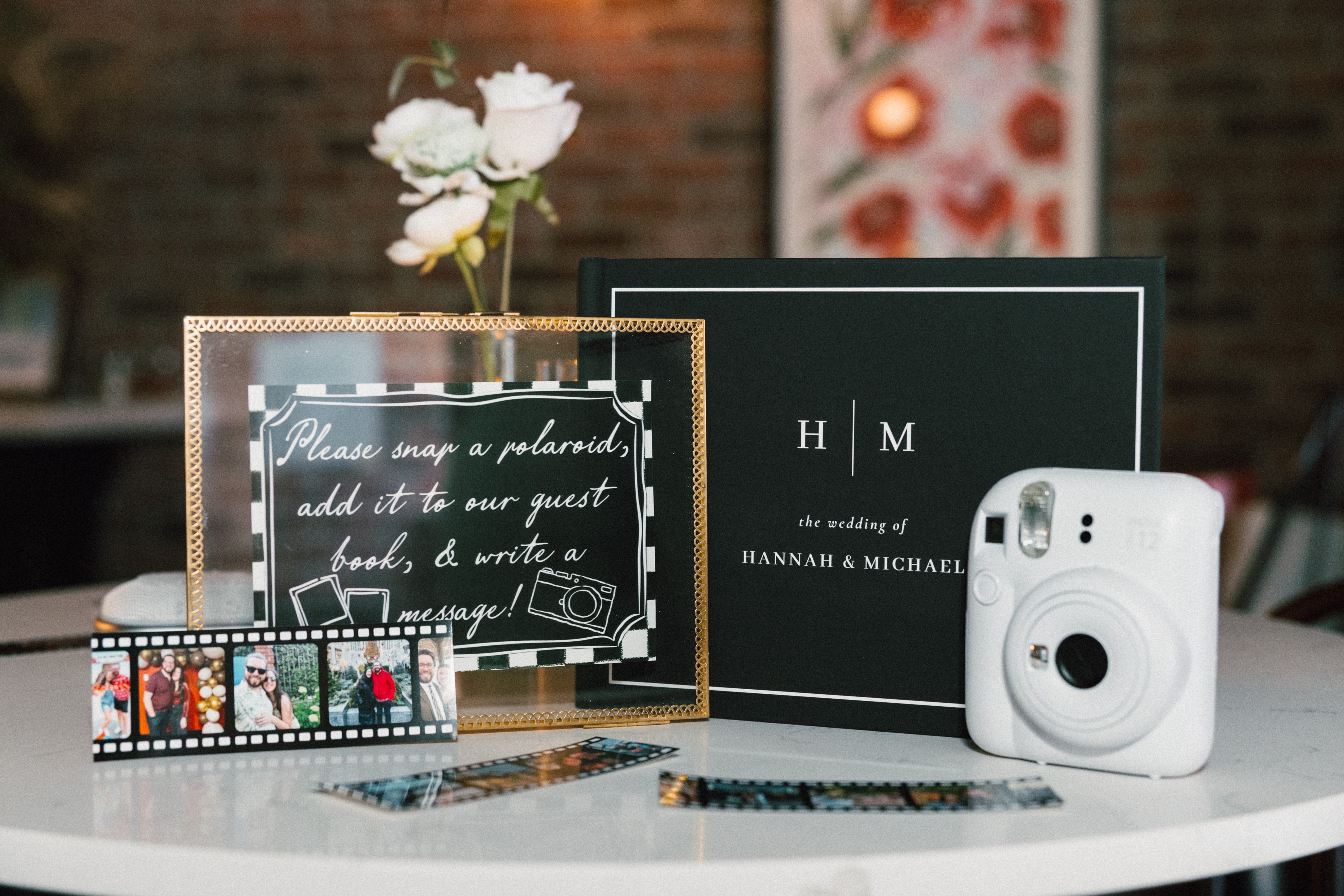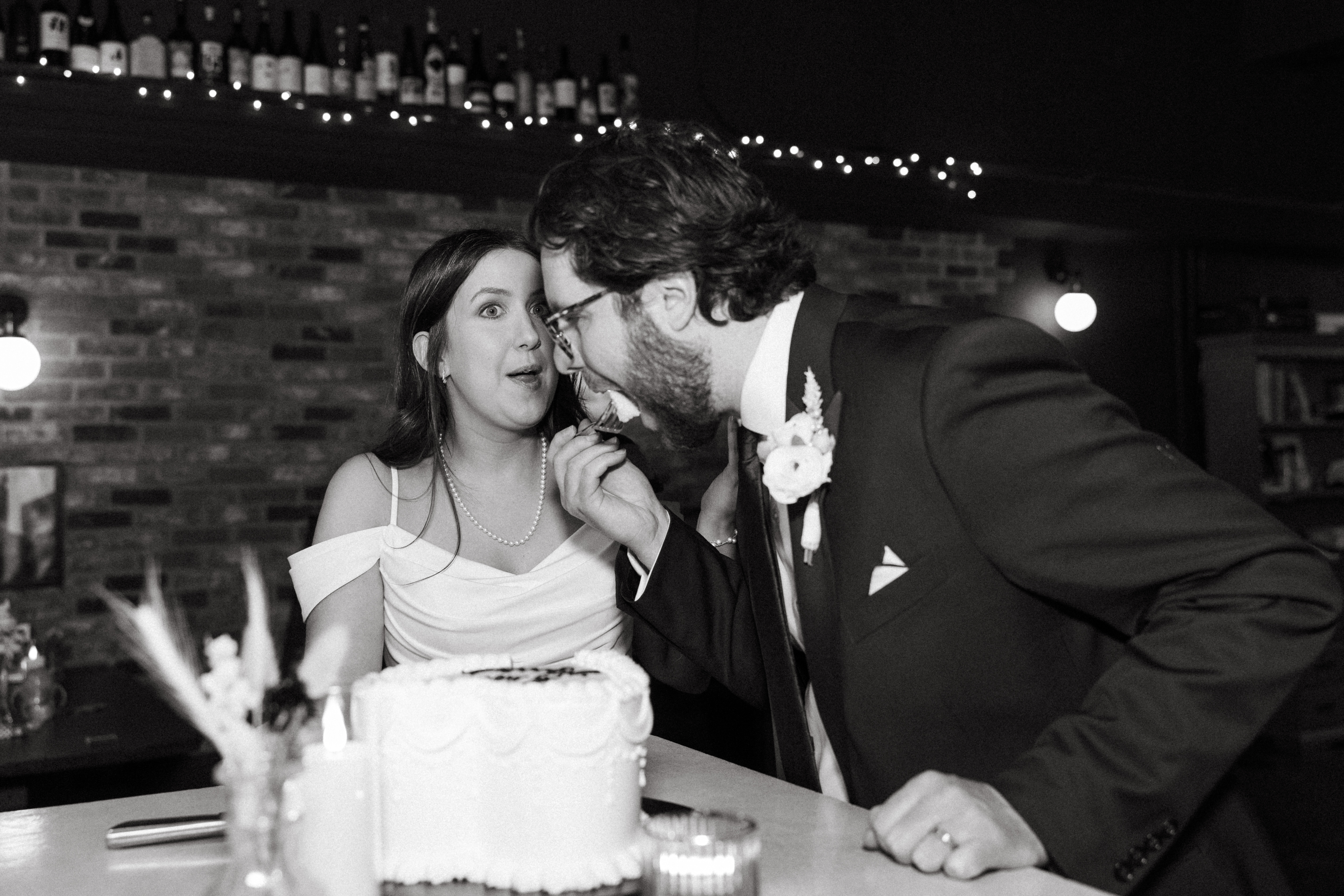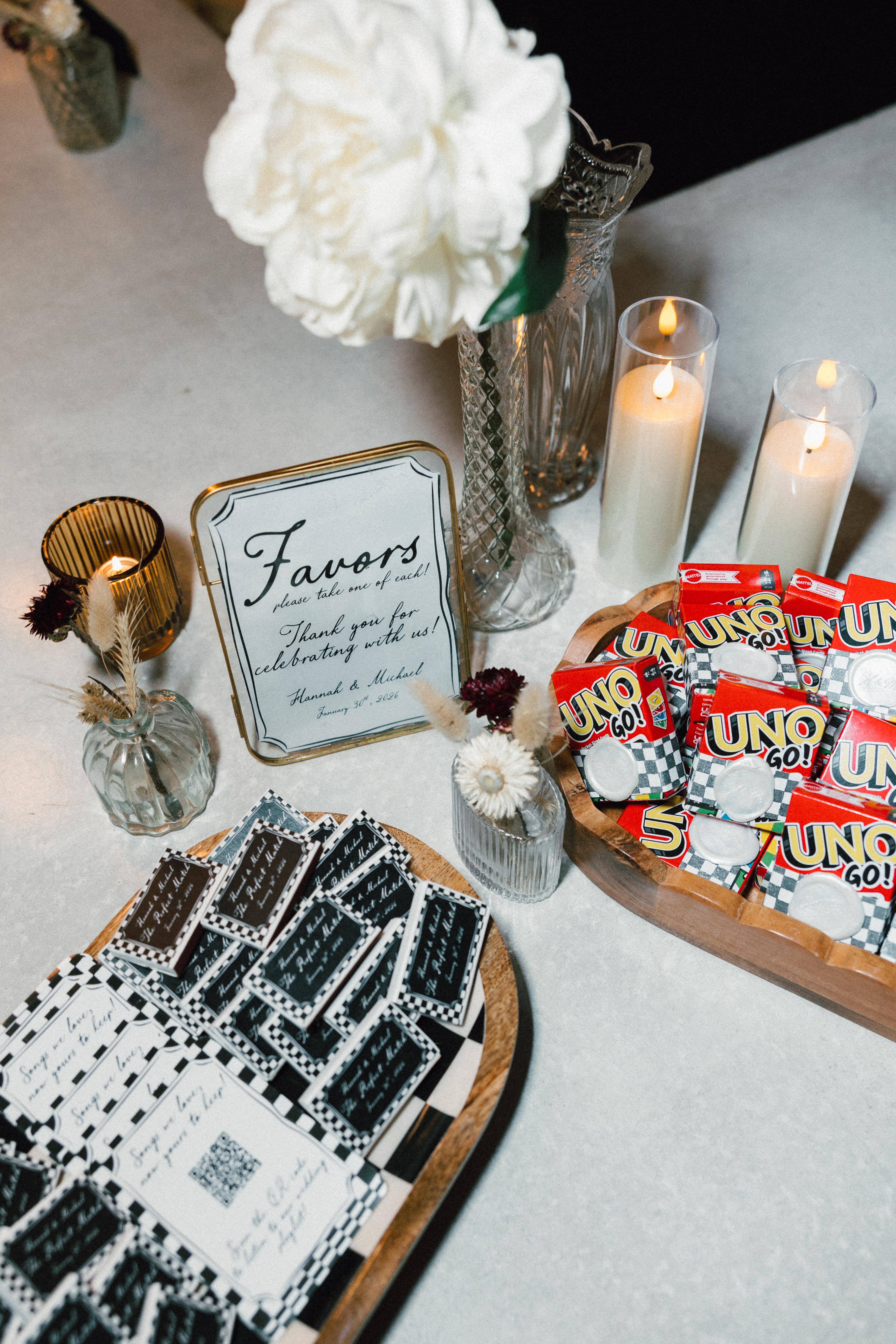 Finally, we headed to the North Side to their intimate reception/after party at Alberta’s Pizzeria. This place is SO COOL!!! It’s a frequent date night spot for H + M, and they’ve become friends with the servers and bartenders, so they knew they had to incorporate it into their celebration! I loved all the little details and personal touches – Uno cards (they love Uno), checkered matchbooks, Polaroid guestbook, and a classic B&W heart-shaped cake.
