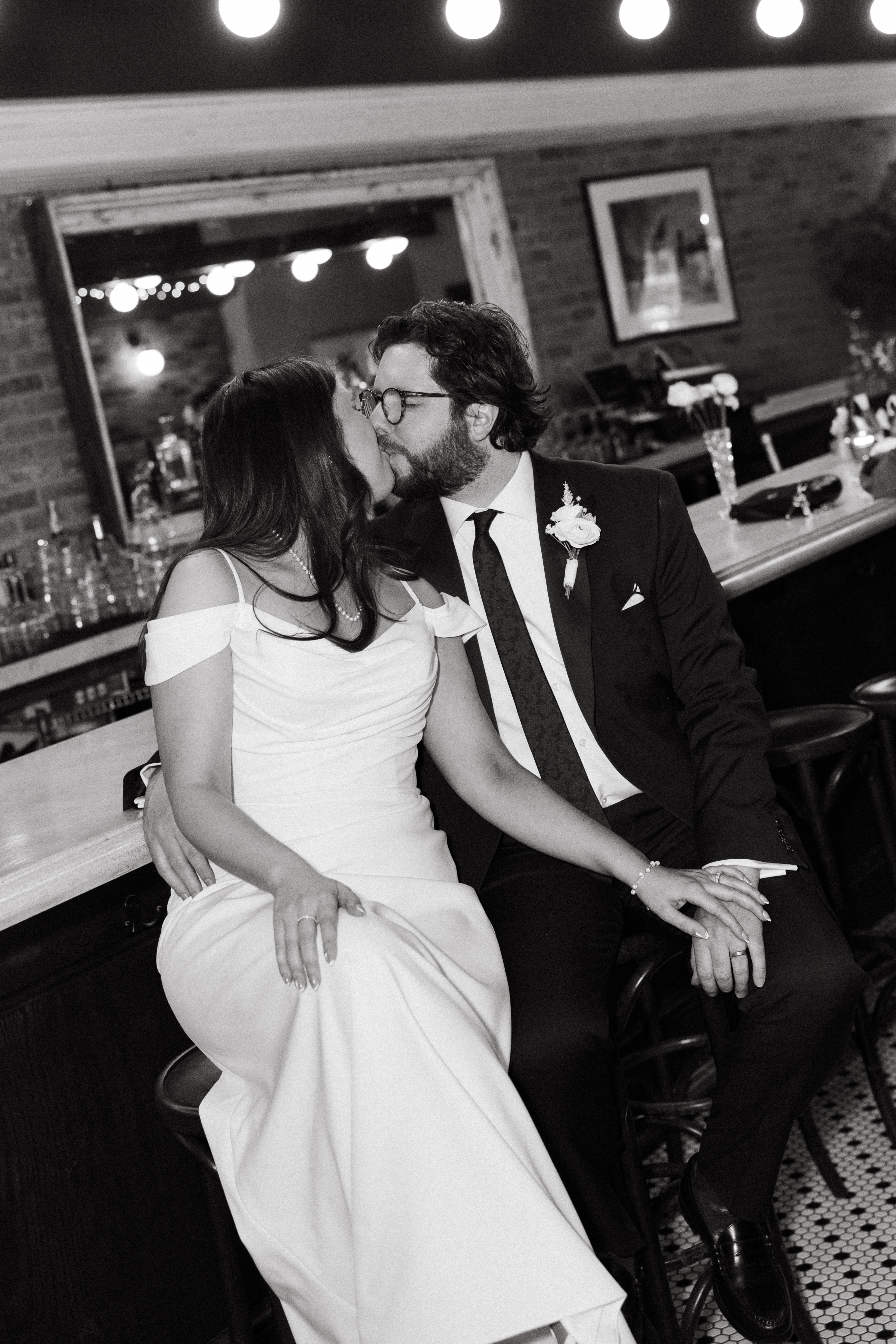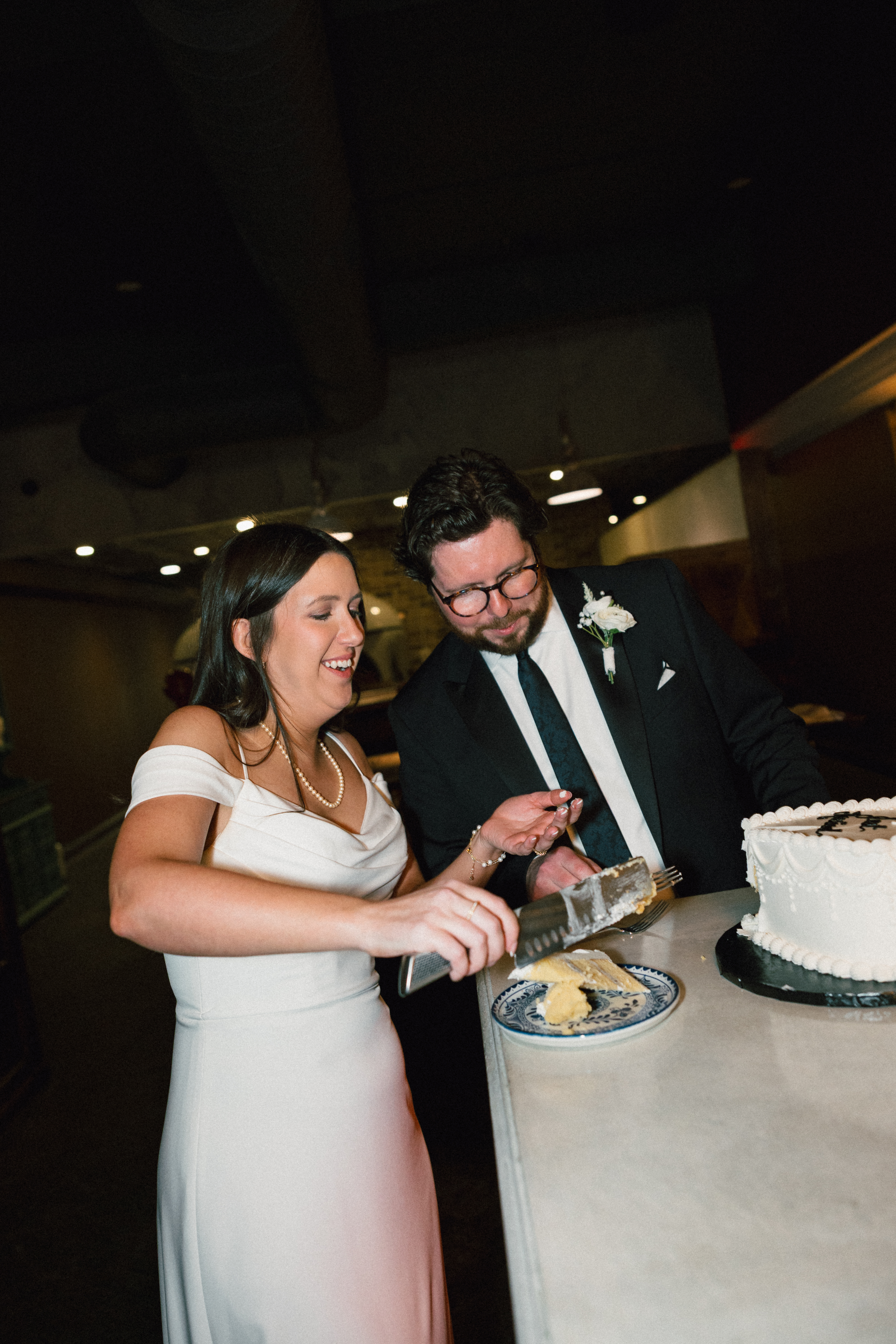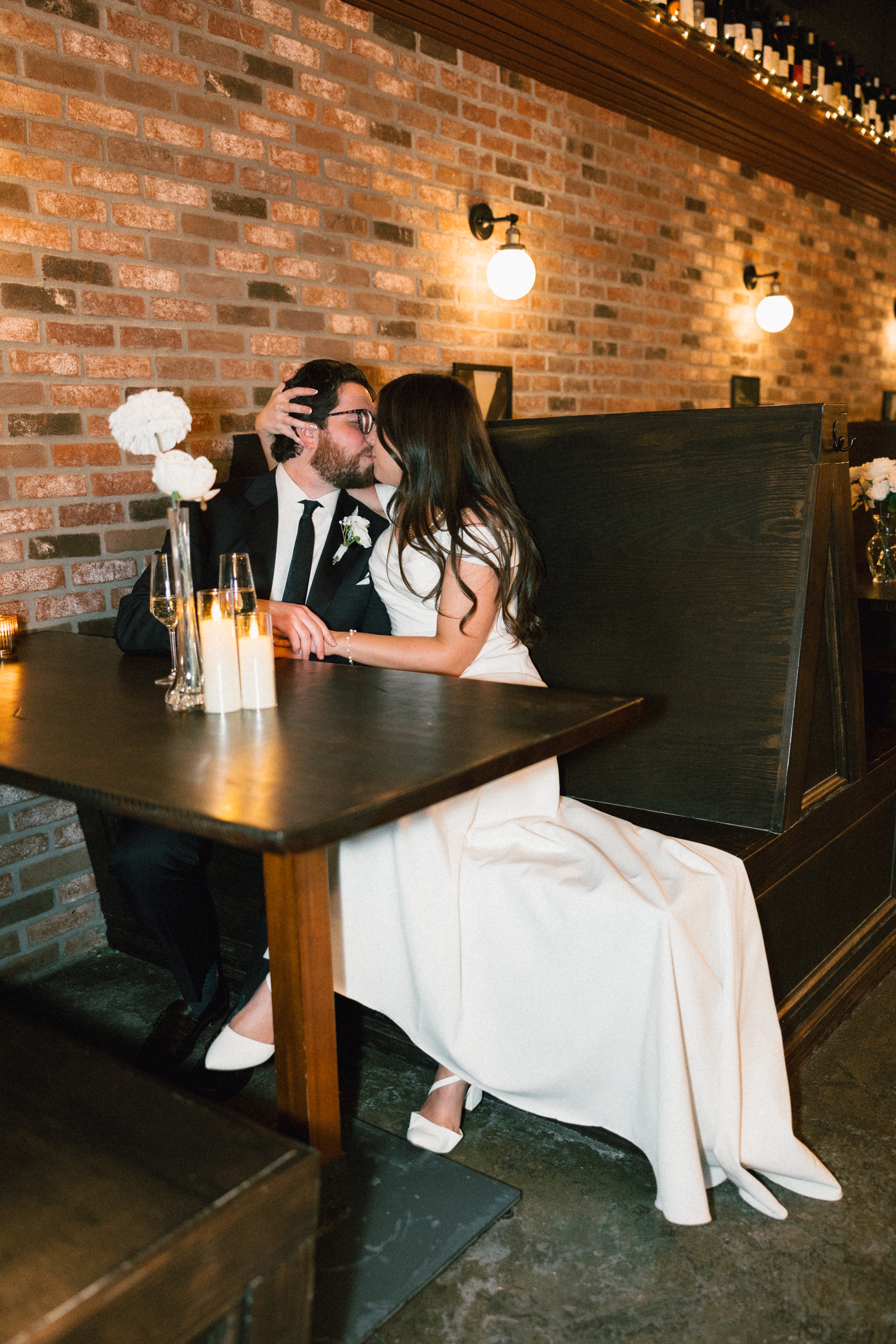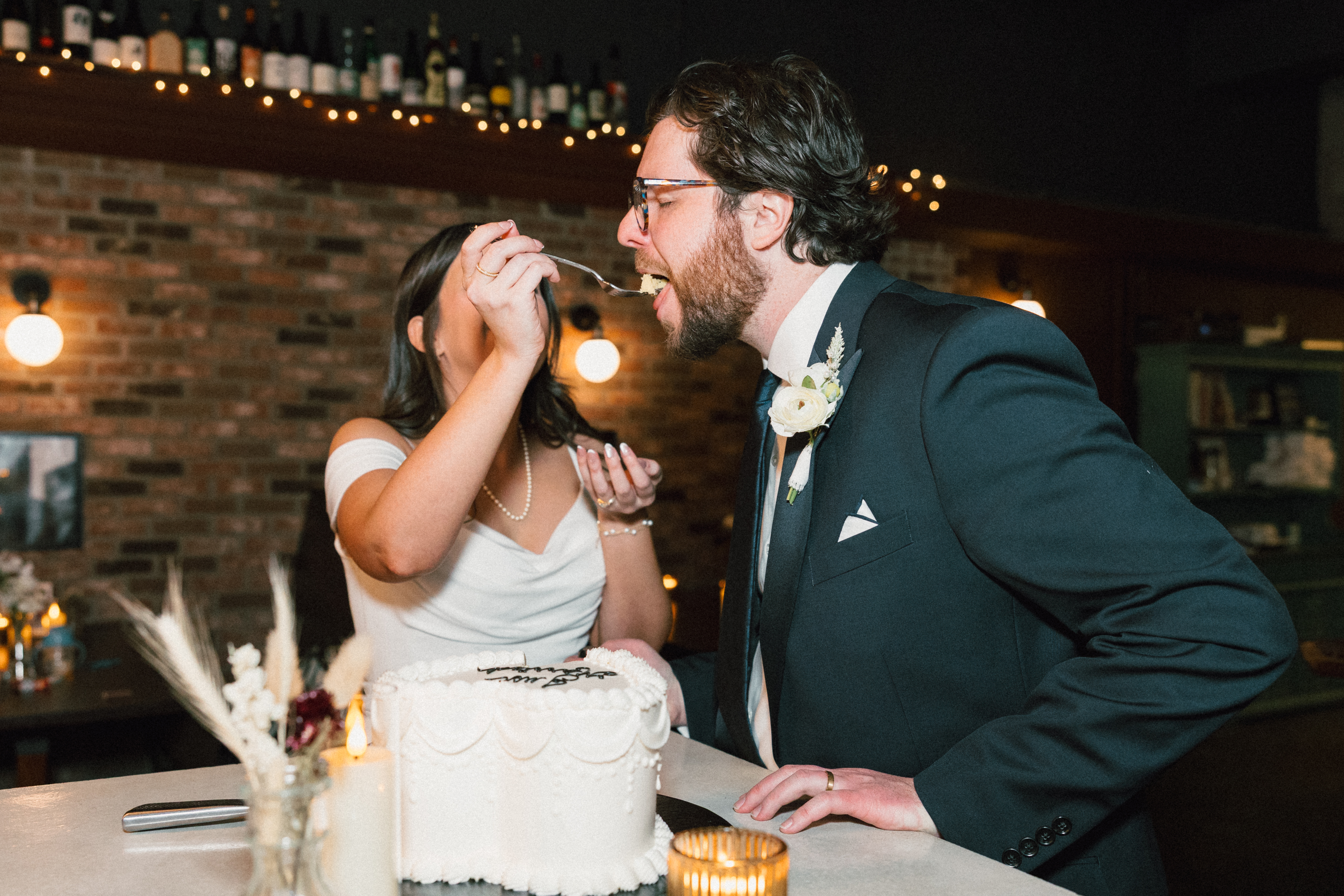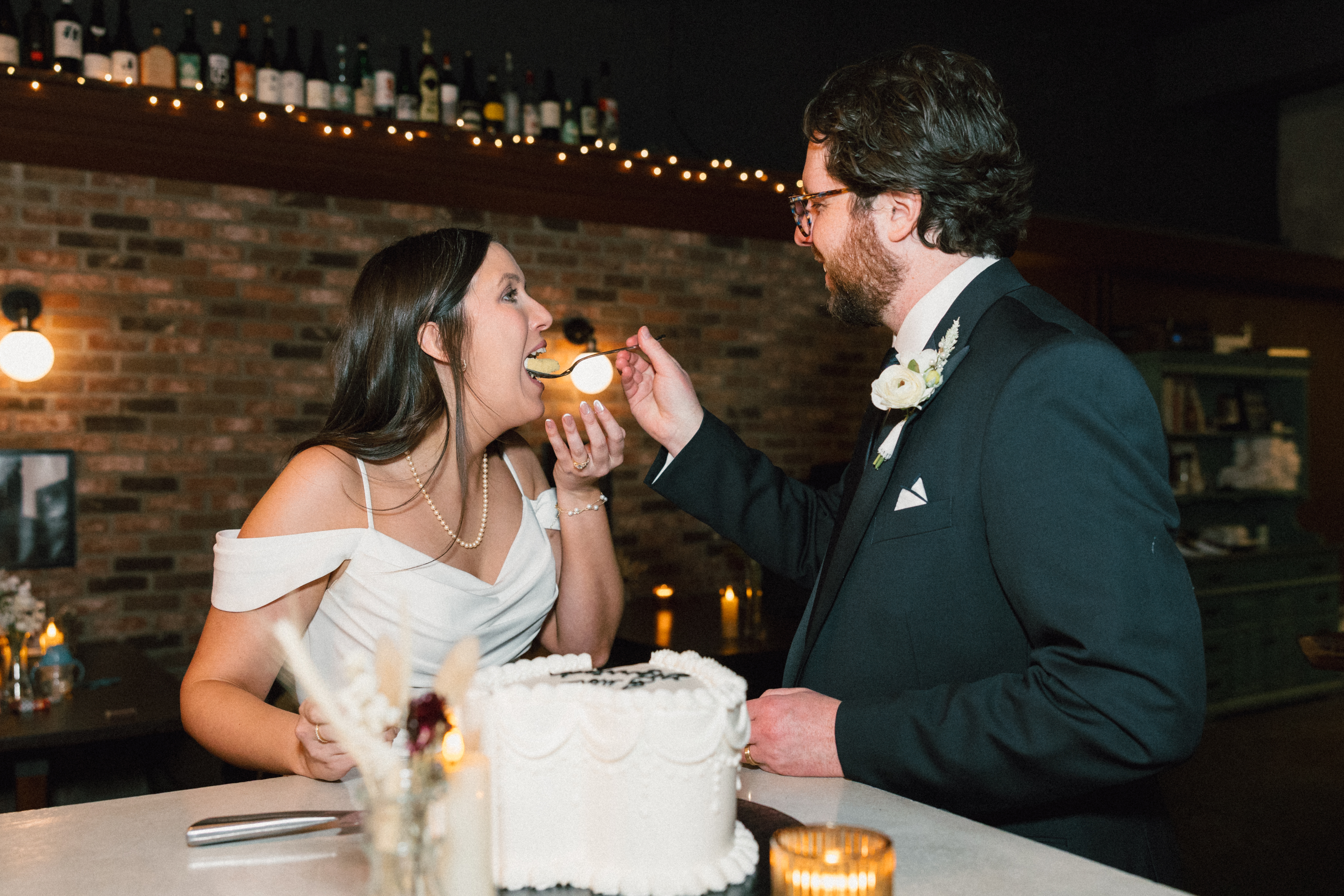 Finally, we headed to the North Side to their intimate reception/after party at Alberta’s Pizzeria. This place is SO COOL!!! It’s a frequent date night spot for H + M, and they’ve become friends with the servers and bartenders, so they knew they had to incorporate it into their celebration! I loved all the little details and personal touches – Uno cards (they love Uno), checkered matchbooks, Polaroid guestbook, and a classic B&W heart-shaped cake.