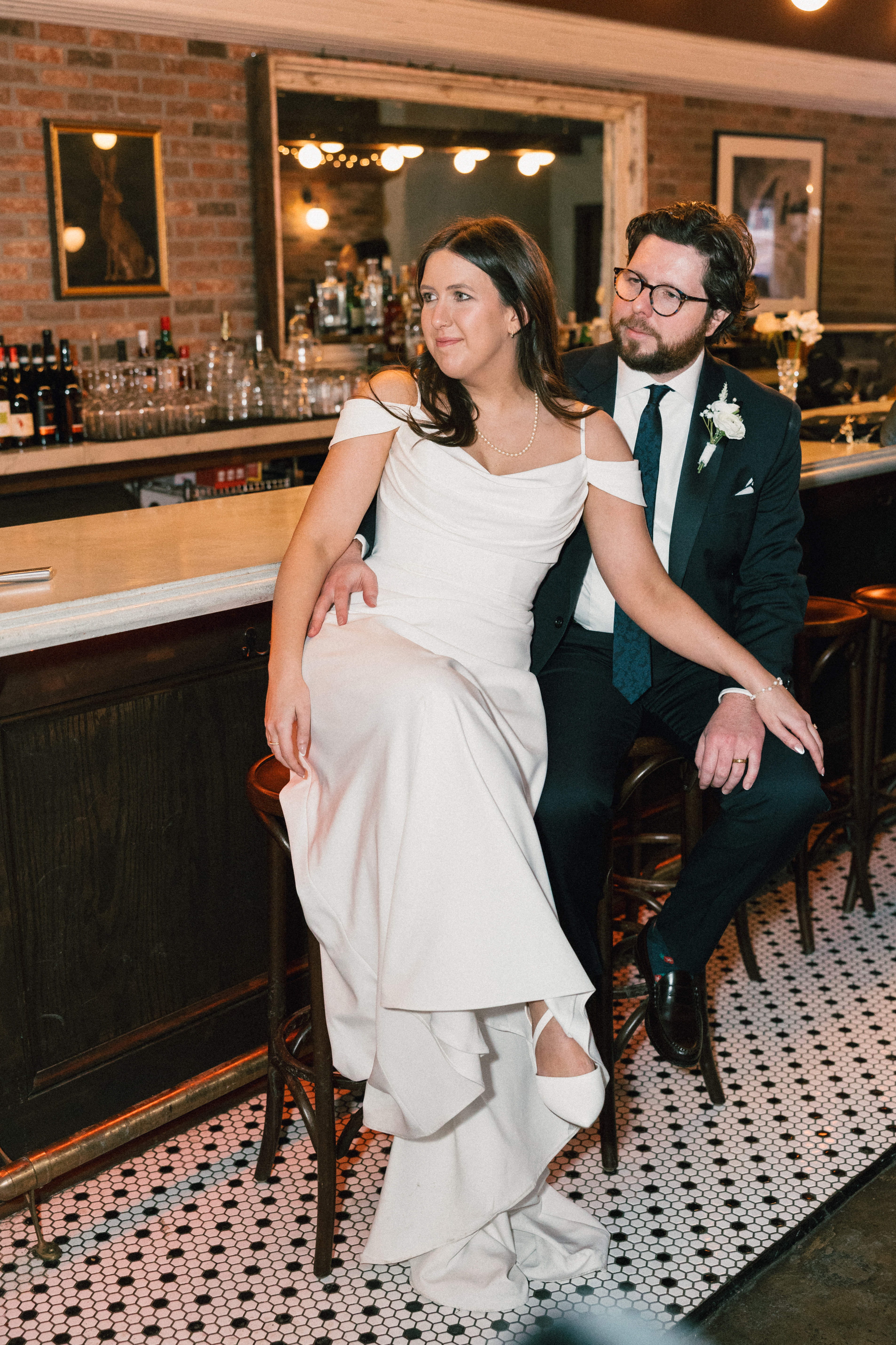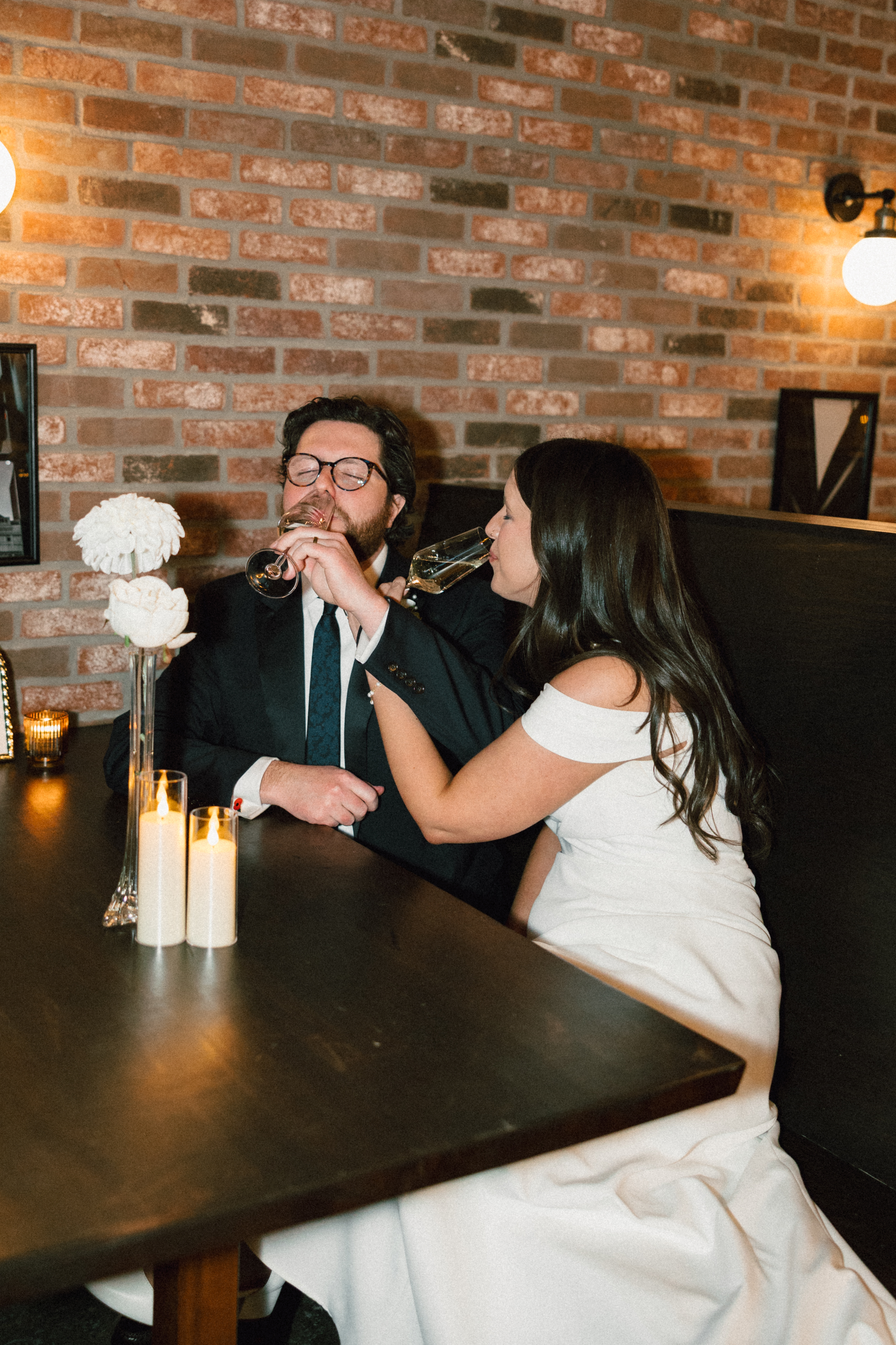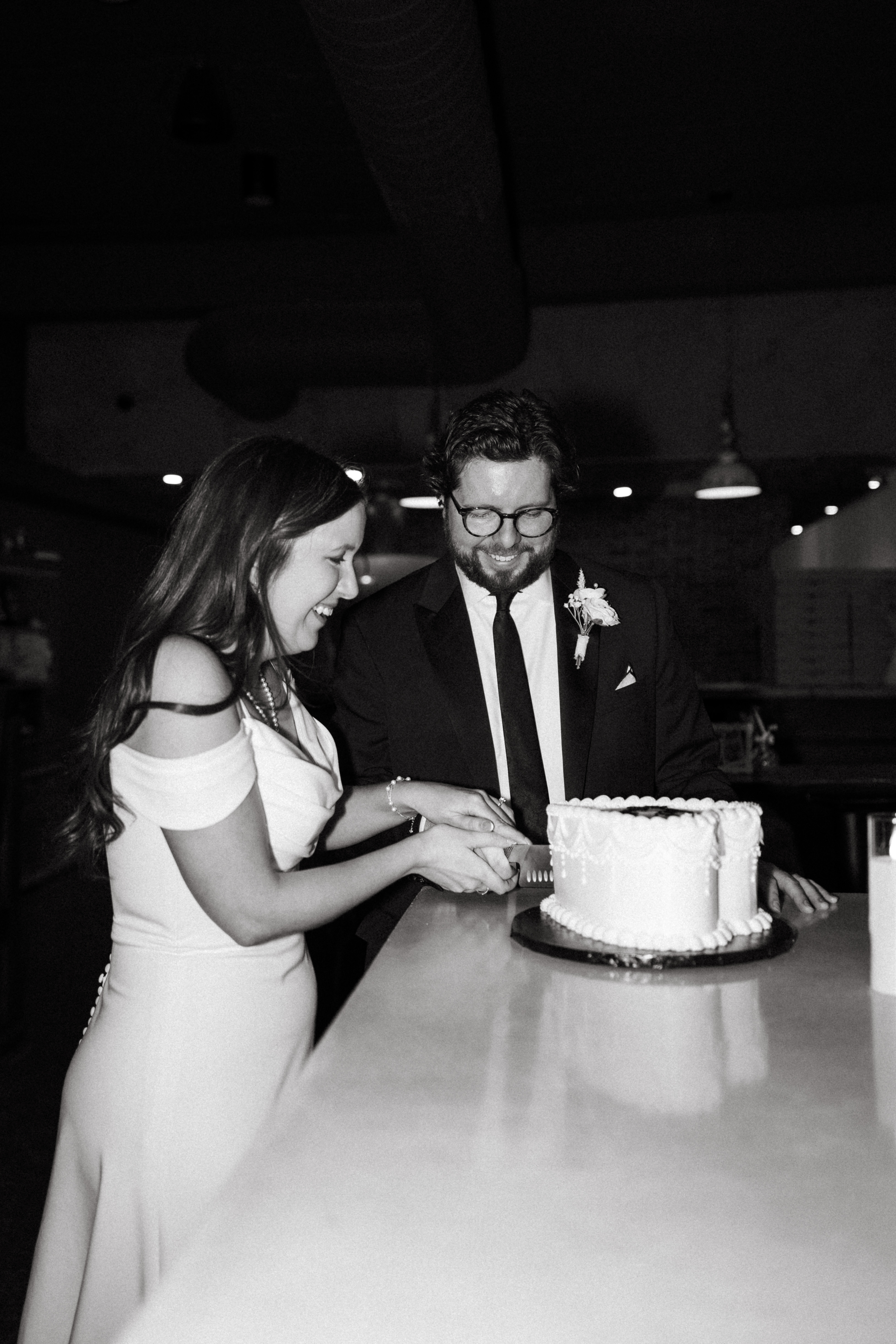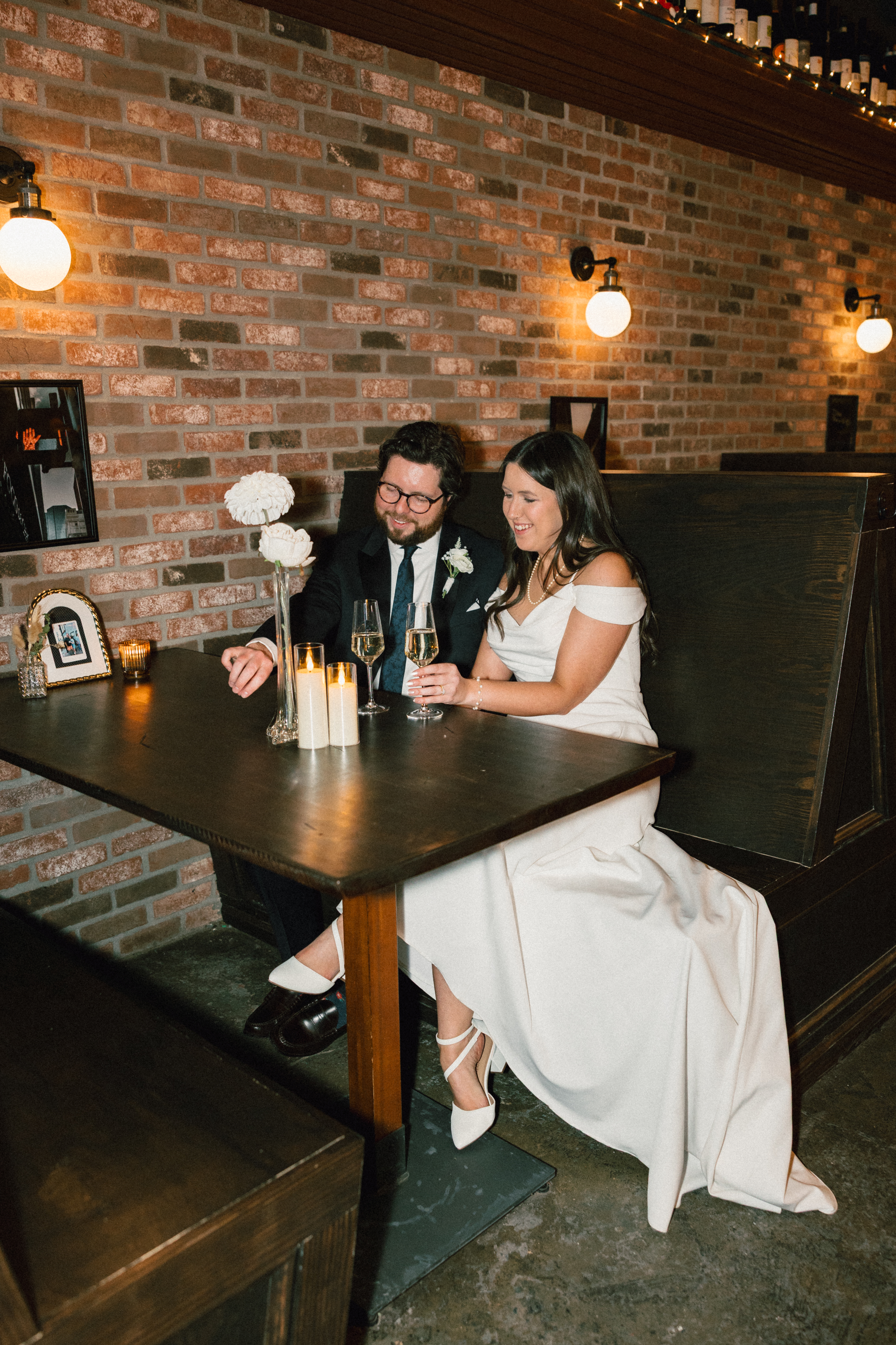 Finally, we headed to the North Side to their intimate reception/after party at Alberta’s Pizzeria. This place is SO COOL!!! It’s a frequent date night spot for H + M, and they’ve become friends with the servers and bartenders, so they knew they had to incorporate it into their celebration! I loved all the little details and personal touches – Uno cards (they love Uno), checkered matchbooks, Polaroid guestbook, and a classic B&W heart-shaped cake.